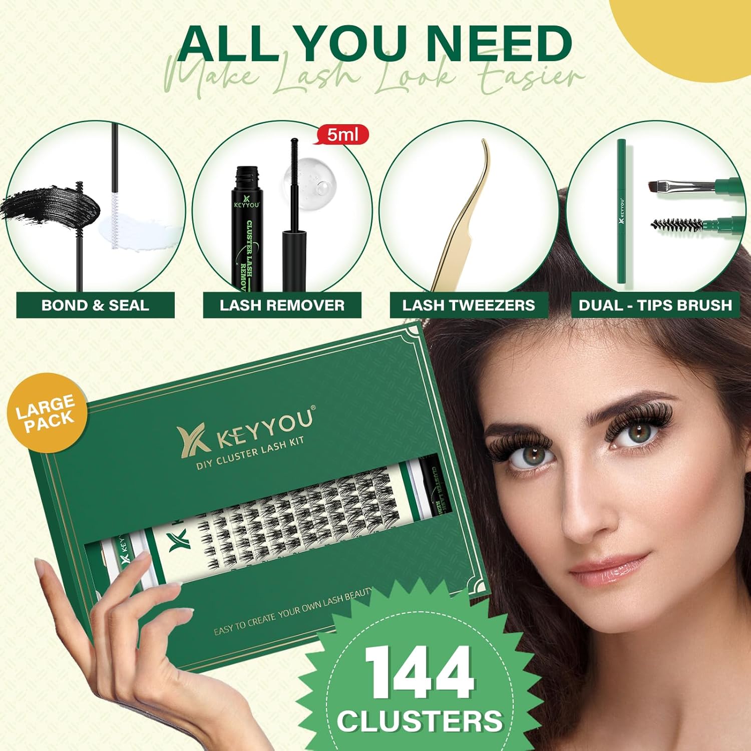 - 【Beginner-friendly Cluster Lash Kit 】The KEYYOU all-inclusive kit provides everything you need for effortlessly stunning lashes. From 144 thin band Cluster Lashes(8*1,10*2,12*3,14*3,16*2,18*1) to the Lash Bond and Lock, Cluster Lash Remover, Applicators, lash brush, we've got you covered from start to finish.