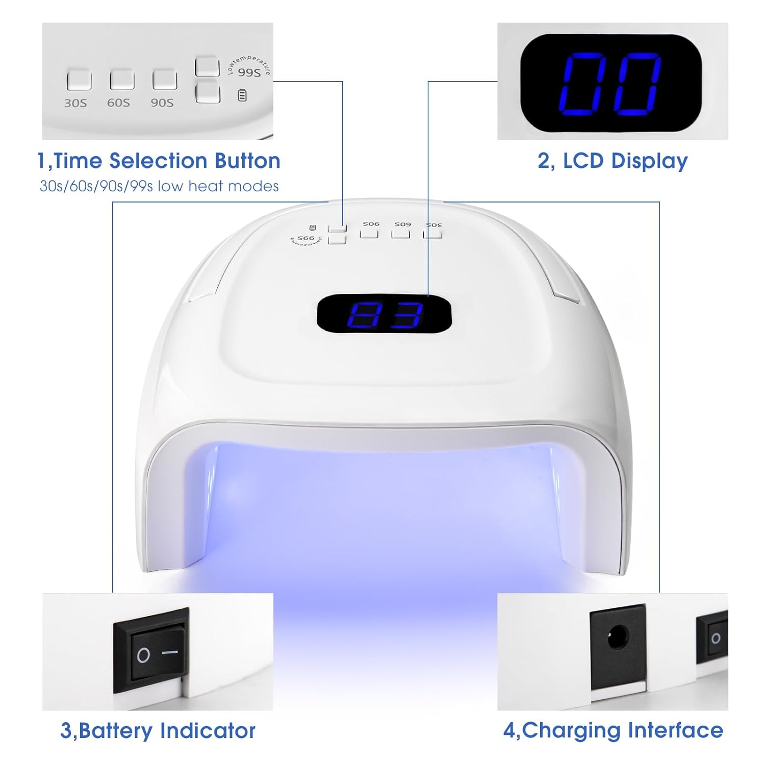 - 4 Timer Setting & LCD Screen: This gel led light for nails has 4 timer setting(30/60/90/99S) can show your usage time on large Digital LCD screen,makes your curing process more visible.You choose different gel polishes depending on the time you need
