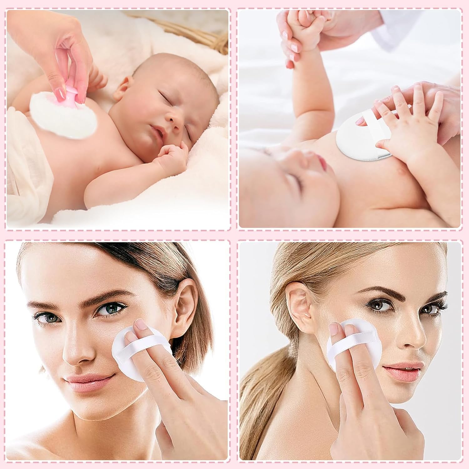 - ă2 Body Powder Puffsă: Considering the daily needs of our customers, our body powder container is equipped with 2 body powder puffs which made of delicate and smooth touch artificial woolďźodorless, individually packaged. The large powder puff with a handle can directly take an appropriate powder apply for body, fast and convenient! The small puff (2.36 ") can take a small amount of powder more delicate and apply evenly on baby skin.