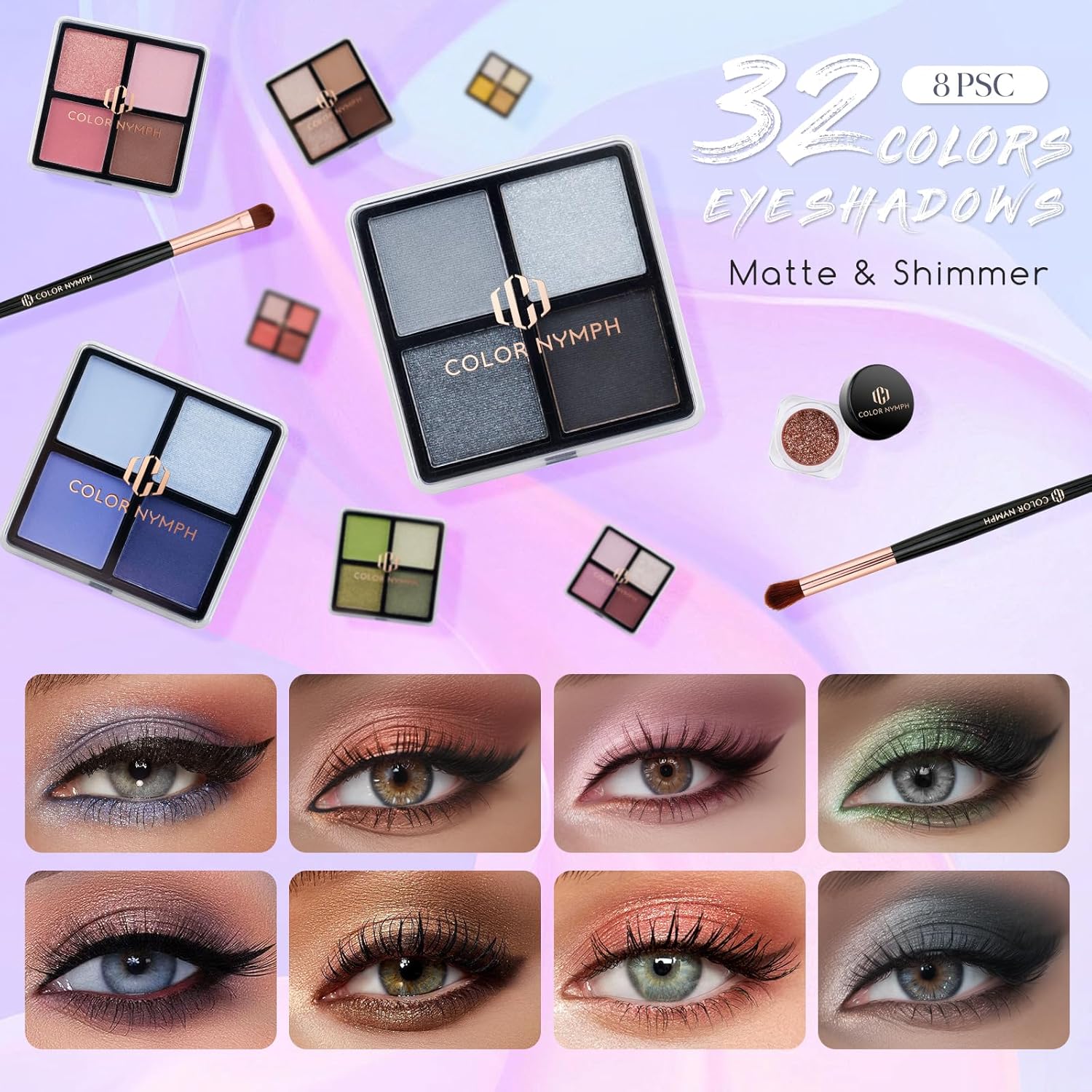 Color Nymph Beginners Makeup Kit With Train Case For Teenagers Girls, Full Starter Cosmetics Set Included 32 Colors Eyeshadow, Glitter Cream, Blush, Highlighter, Lip Gloss and Brush (White)