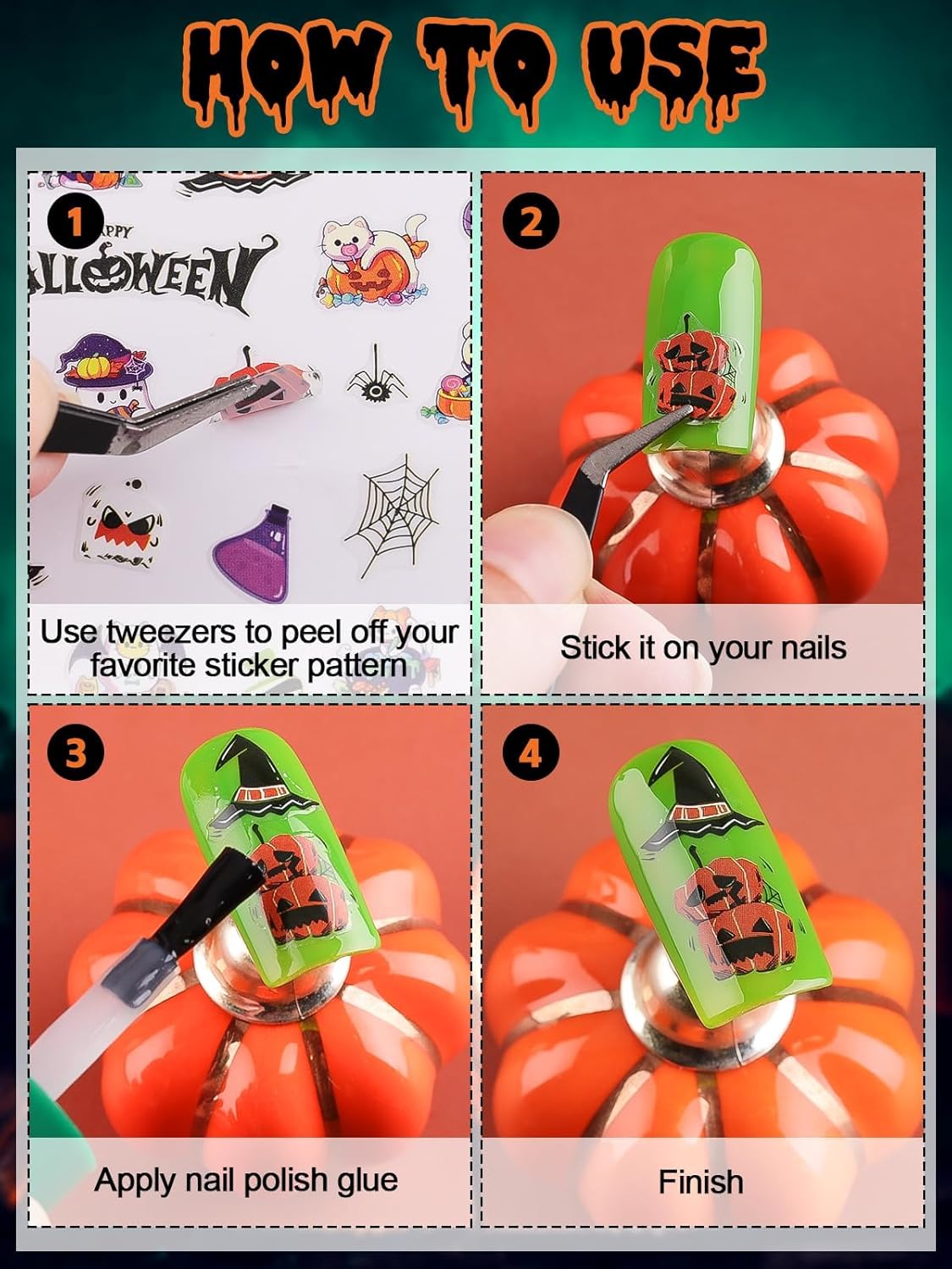 - ăEasy to Useă3D Self-adhesive Halloween nail stickers make it easy to stick well on your nail. Just use tweezers to peel and stick it on your nail. We suggest you can also use nail gel top coat to cover to make the stickers last longer. These are NOT water transfer ones!