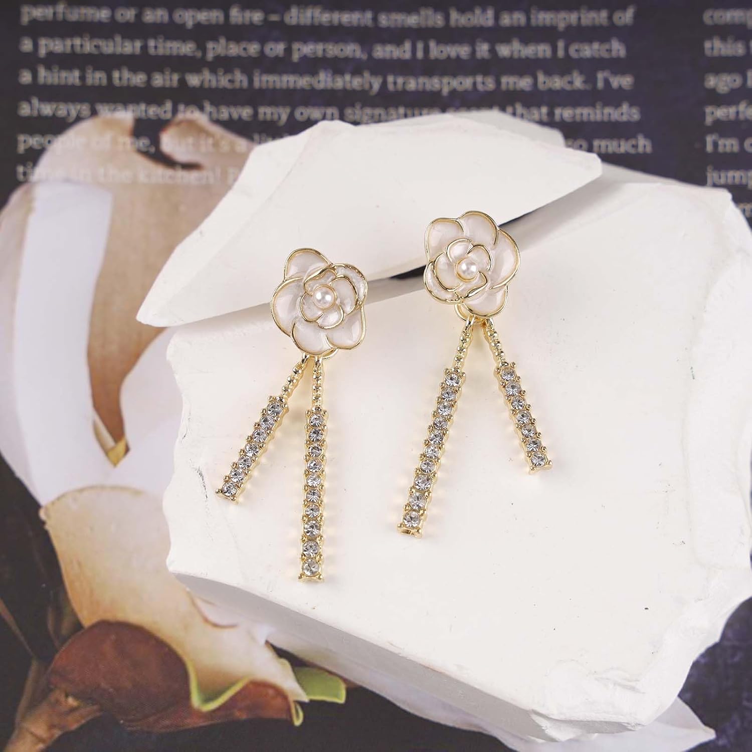 Vintage Crystal Flower Drop Earrings Pearl Camellia Earrings White Camellia Stud Earring Gold Linear Rhinestone Earring Jewelry for Women