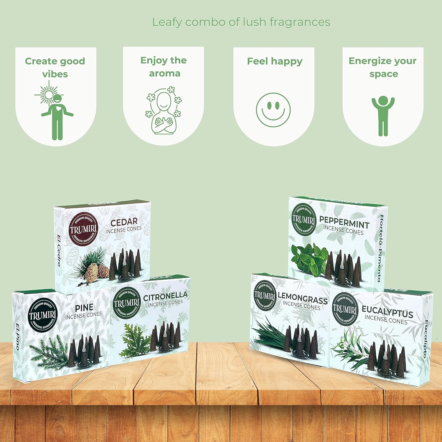 TRUMIRI Leafy Incense Cones - Variety Pack - Total 60 Cone Incense (6 Scents x 10 Conos) - Citronella Lemongrass Eucalyptus Peppermint Cedar Pine - Cone Incense Scents - Insense Cones - Incent Cone