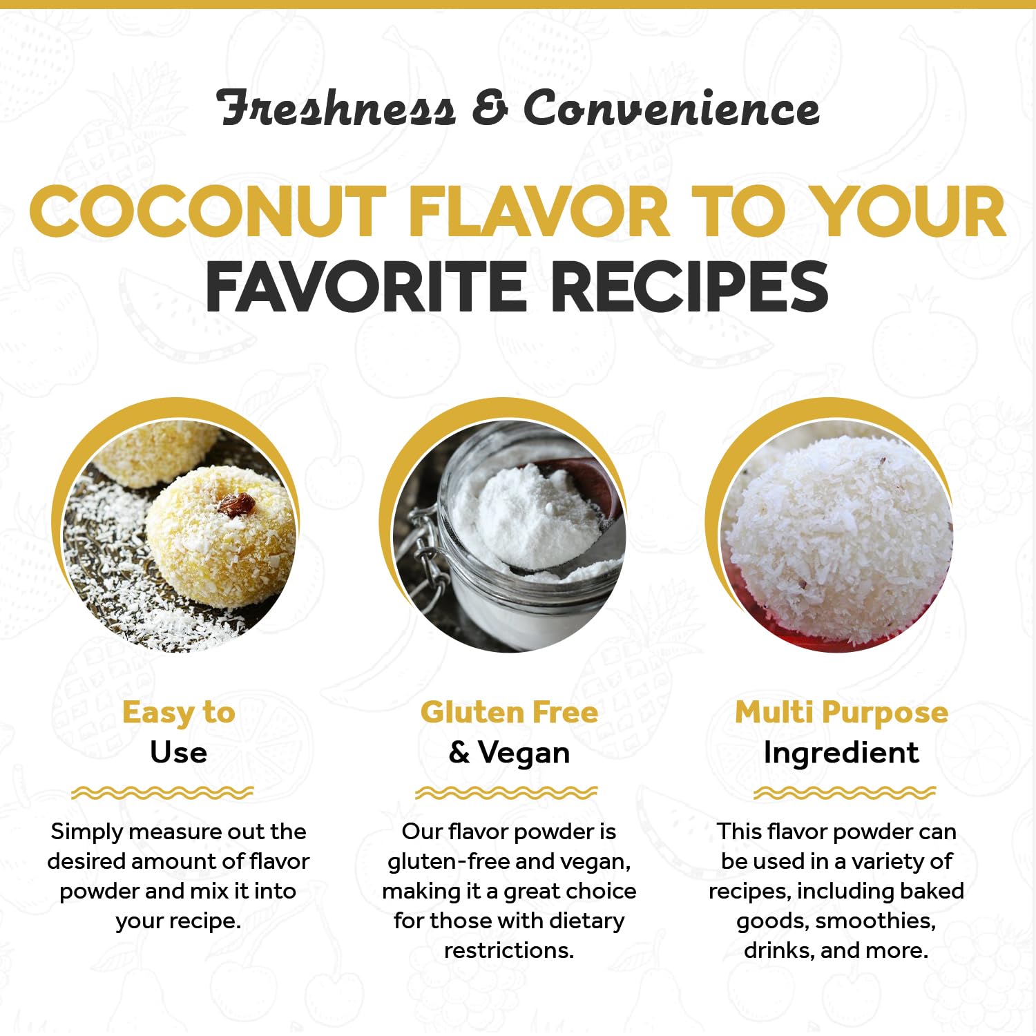 - ๐๐๐ฌ๐ฒ ๐ญ๐จ ๐ฎ๐ฌ๐:Simply measure out the desired amount of Coconut flavor powder and mix it into your recipe. No need to chop, grind, or blend Coconut, as this powder provides all the nutty flavor you need in a convenient form.