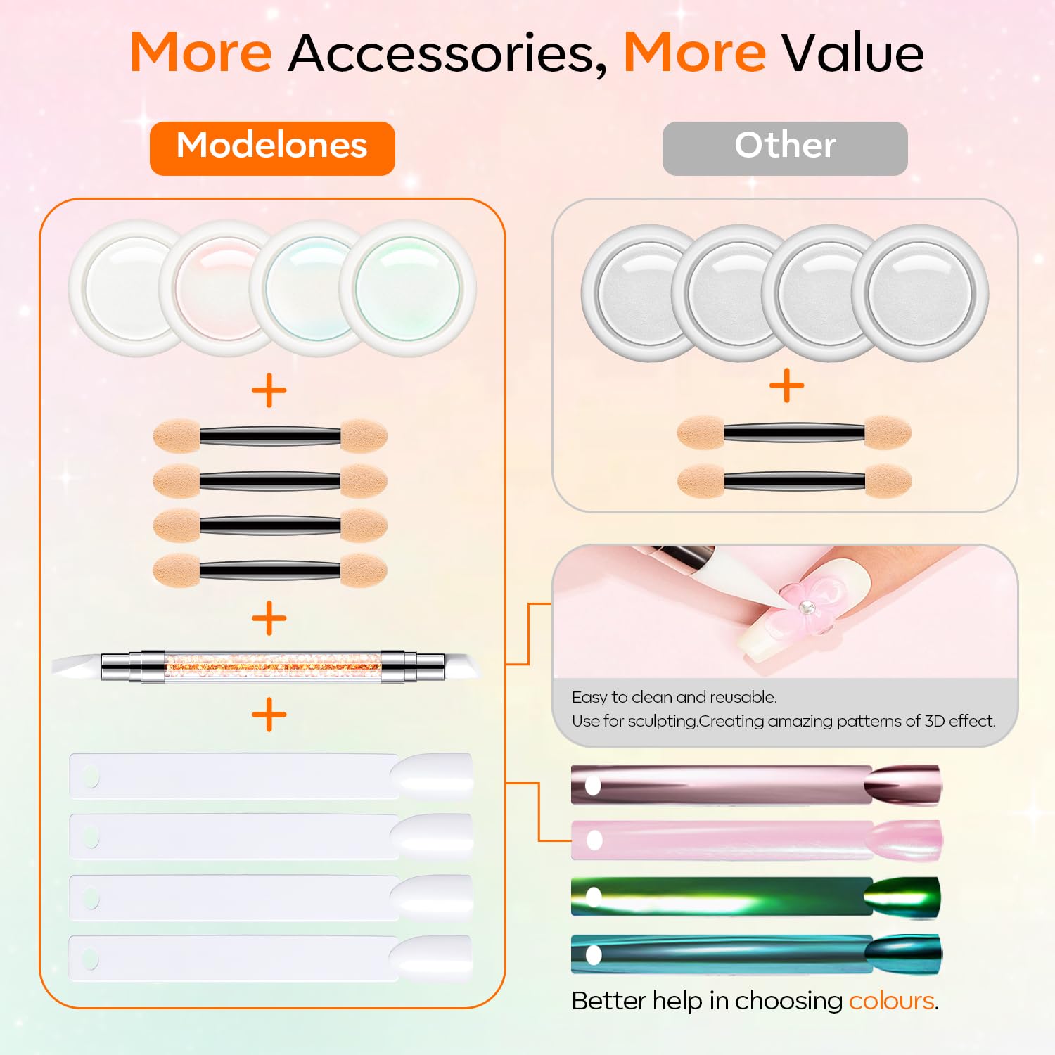 - 【What You Get】 Modelones 4 Jars chrome nail powder kit includes 4 different colors that cover all daily chrome nail design needs, 1*silicon nail brush, 4* applicator brushes, and 4*nail swatch sticks. 1 chrome powder for gel nails kit can do more than 100 nails at home DIY or in salon use.
