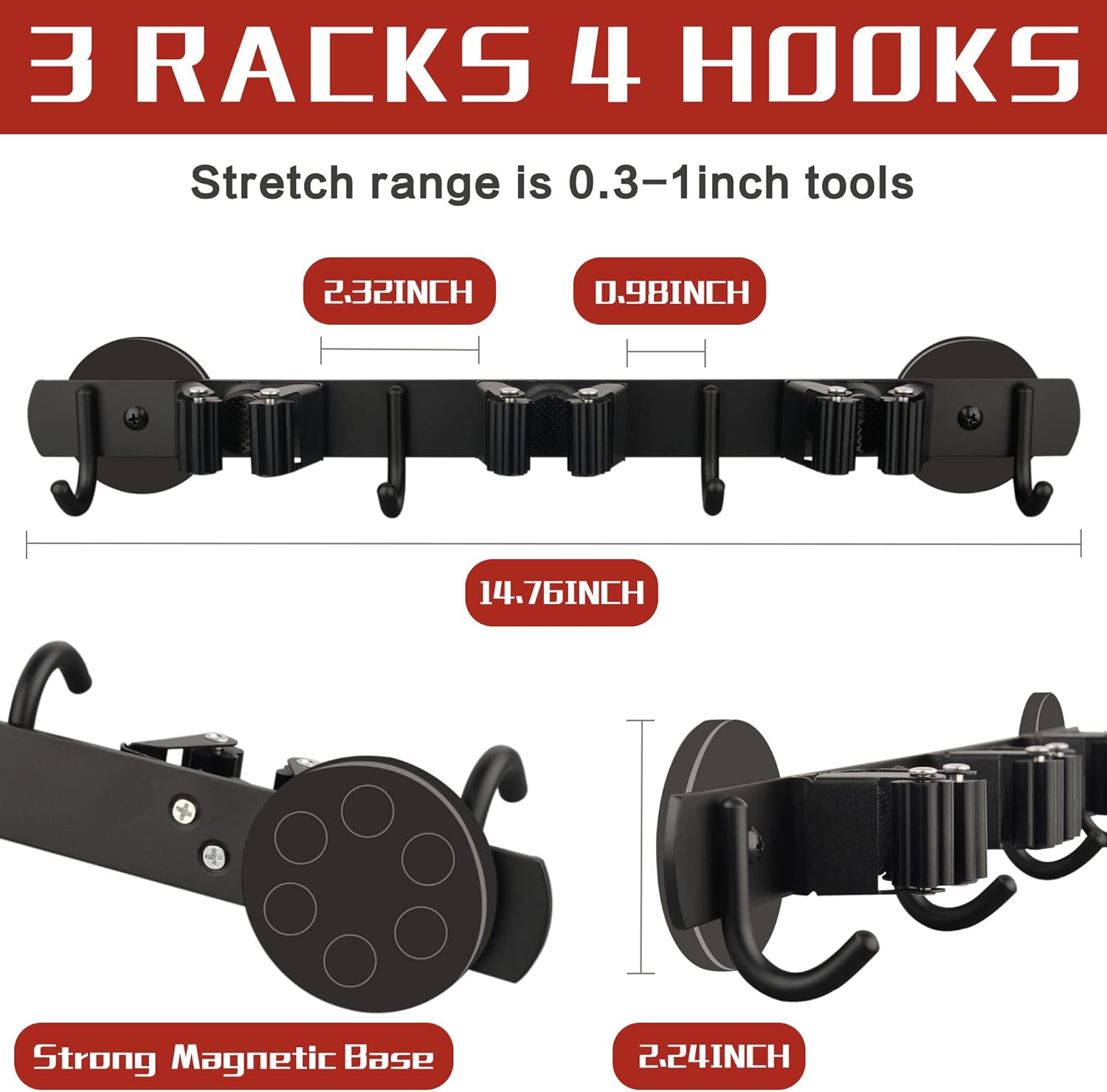ULIBERMAGNET Magnetic Mop Broom Holder,Heavy Duty Movable Magnetic Broom Holder Rack,Anti-slip Wall Mounted Utility Storage Mop Shovel Hanger for Garage, Kitchen, Laundry, Garden(3 Racks / 4 Hooks)