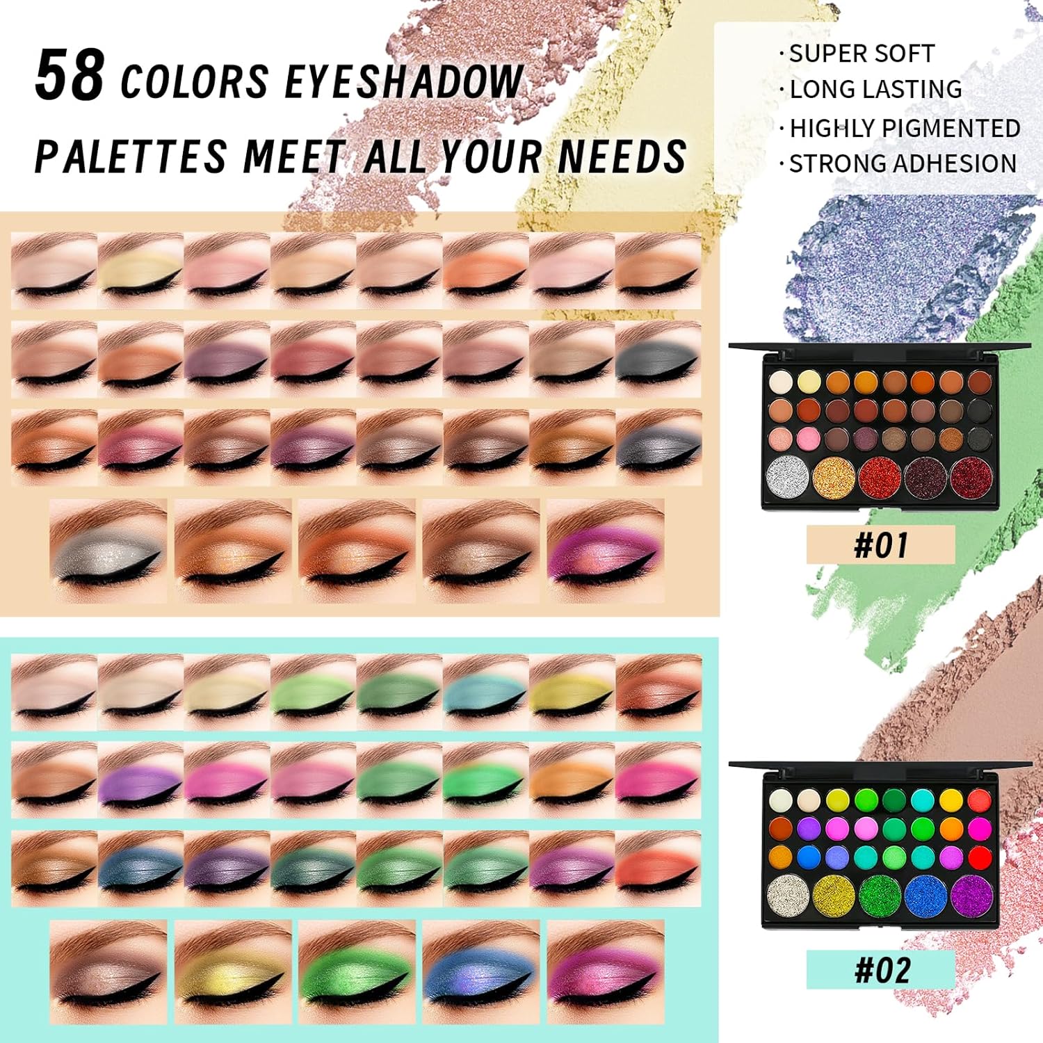 - [Makeup Set] The makeup present set for women includes natural mushroom head air cushion cc cream, full coverage natural & buff Beige foundation, face primer, 2 × 29 colors eyeshadow palette, liquid concealer, counter palette, blush palette, makeup setting powder, eyebrow soap, eyebrow pencil, eyeliner, winged eyeliner stamp, waterproof mascara, lipsticks, liquid lipsticks set, lip oil, makeup brush set, makeup sponges, cosmetic bag.