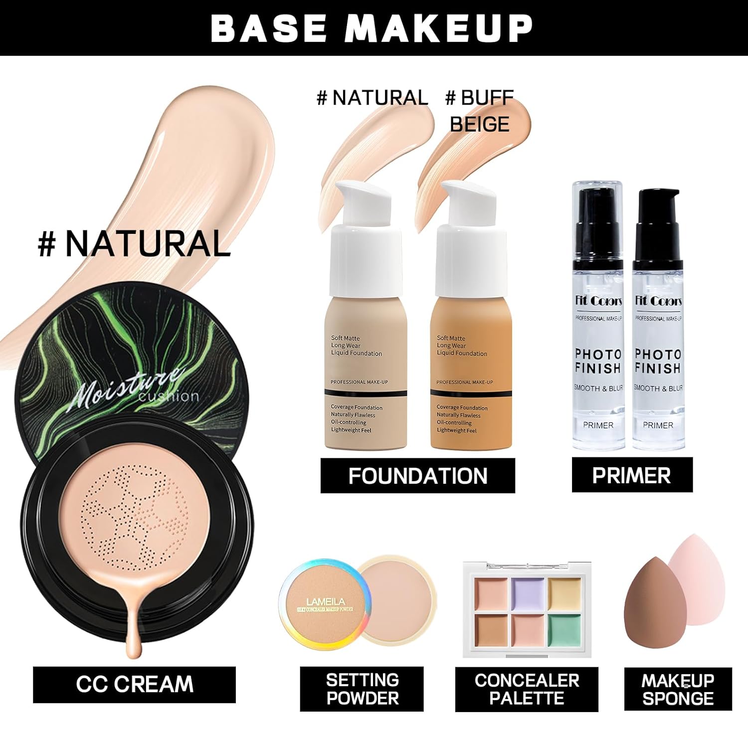 - [Makeup Set] The makeup present set for women includes natural mushroom head air cushion cc cream, full coverage natural & buff Beige foundation, face primer, 29 colors eyeshadow palette, 18 colors eyeshadow palette, 6 color counter concealer palette, blush palette, makeup setting powder, eyebrow soap, eyebrow pencil, eyeliner, winged eyeliner stamp, waterproof mascara, lipsticks, liquid lipsticks set, lip oil, makeup brush set, makeup sponges, cosmetic bag.