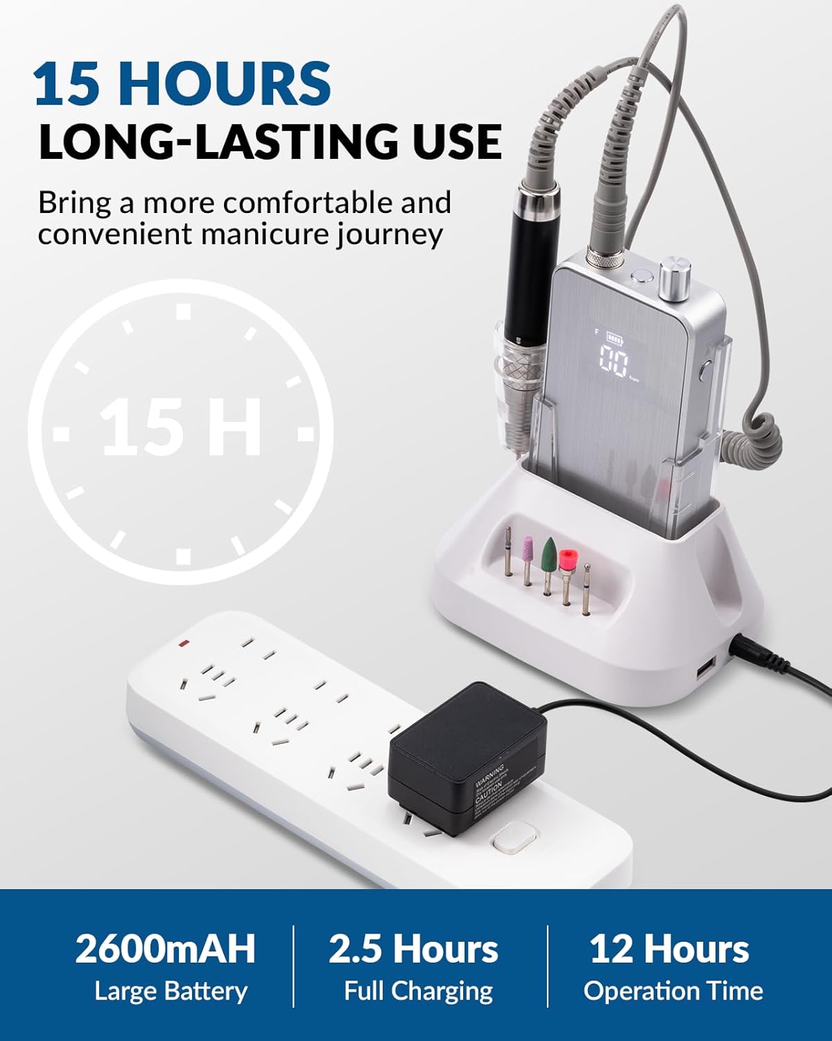 - 【Rechargeable & Portable】2600mAH high capacity and ultra long-lasting high-quality lithium battery, fully charged in 2.5 hours for 12 hours of continuous work, whether at home or in the salon can be enjoyed at will, a must-have portable electric nail file for achieving professional quality manicures and pedicures.