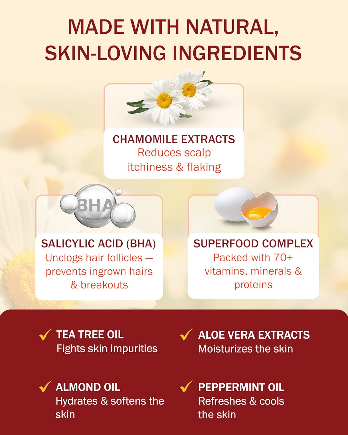 - Potent Natural Ingredients: Salicylic acid shampoo with chamomile extract, and tea tree oil, and infused with a skin-loving superfood complex, aloe vera, and peppermint oil, this itchy scalp shampoo and hair serum for women and men support optimal scalp and hair care.