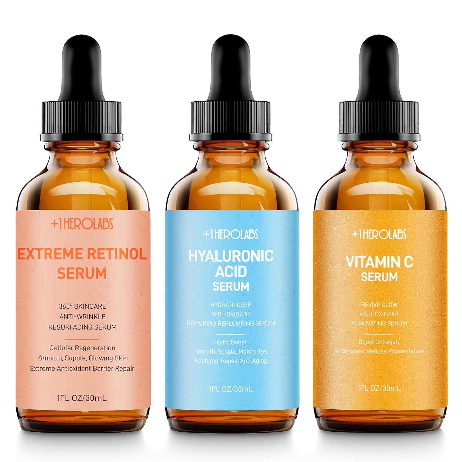 - SKIN CARE SET: This gift set includes Vitamin C Face Serum, Retinol Serum and Hyaluronic Acid Serum. Three anti-aging facial serums, formulated with our most active ingredients for your day and nighttime routine, visibly enhance radiance, moisturize and diminish dullness, help diminish the appearance of fine lines, and provide effective antioxidant and anti-aging benefits.
