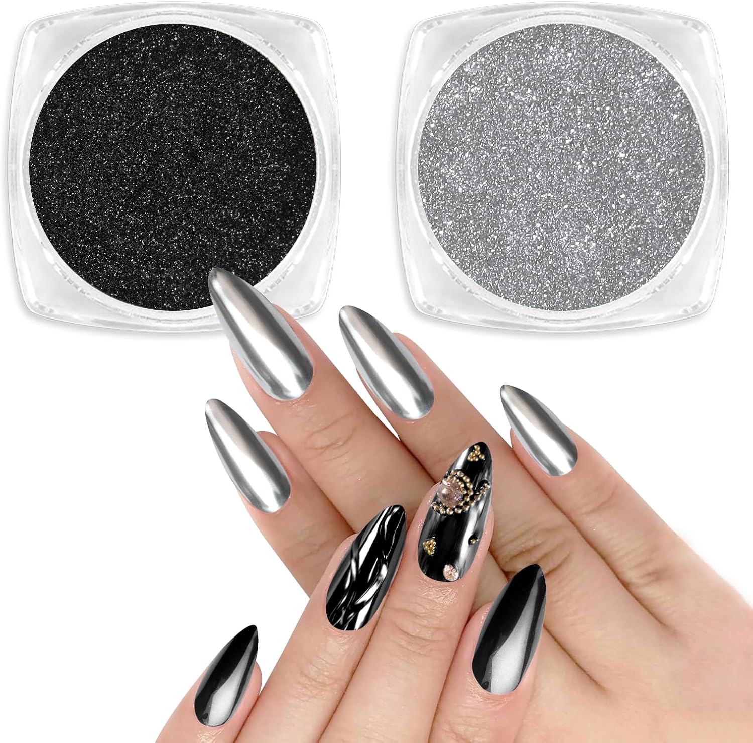 - Great Mirror Effect: It is an ideal black chrome nail powder and silver chrome nail powder kit to create a mirror effect, water ripple effect, bubble effect, star effect for your acrylic extensions, gel extensions, and gel polish manicures. The chrome glitter has delicate powder and attractive luster, which makes it have an excellent mirror effect. Create your unique nail art with Allstarry holographic chrome manicure pigment.