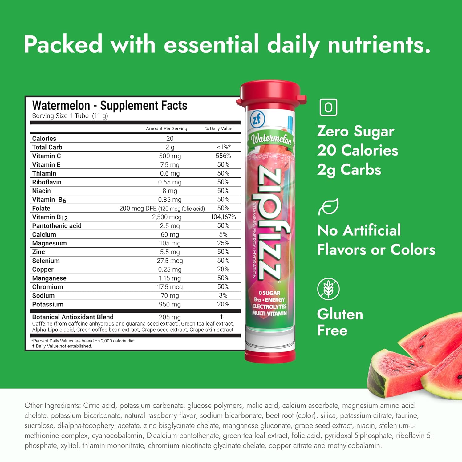 Zipfizz Daily Energy Drink Powder, Watermelon, 20 Pack | 3-in-1 Sustained Energy, Rapid Hydration, and Essential Vitamins | Sugar-Free | Electrolyte Powder | Contains Vitamin B-12 & Antioxidants