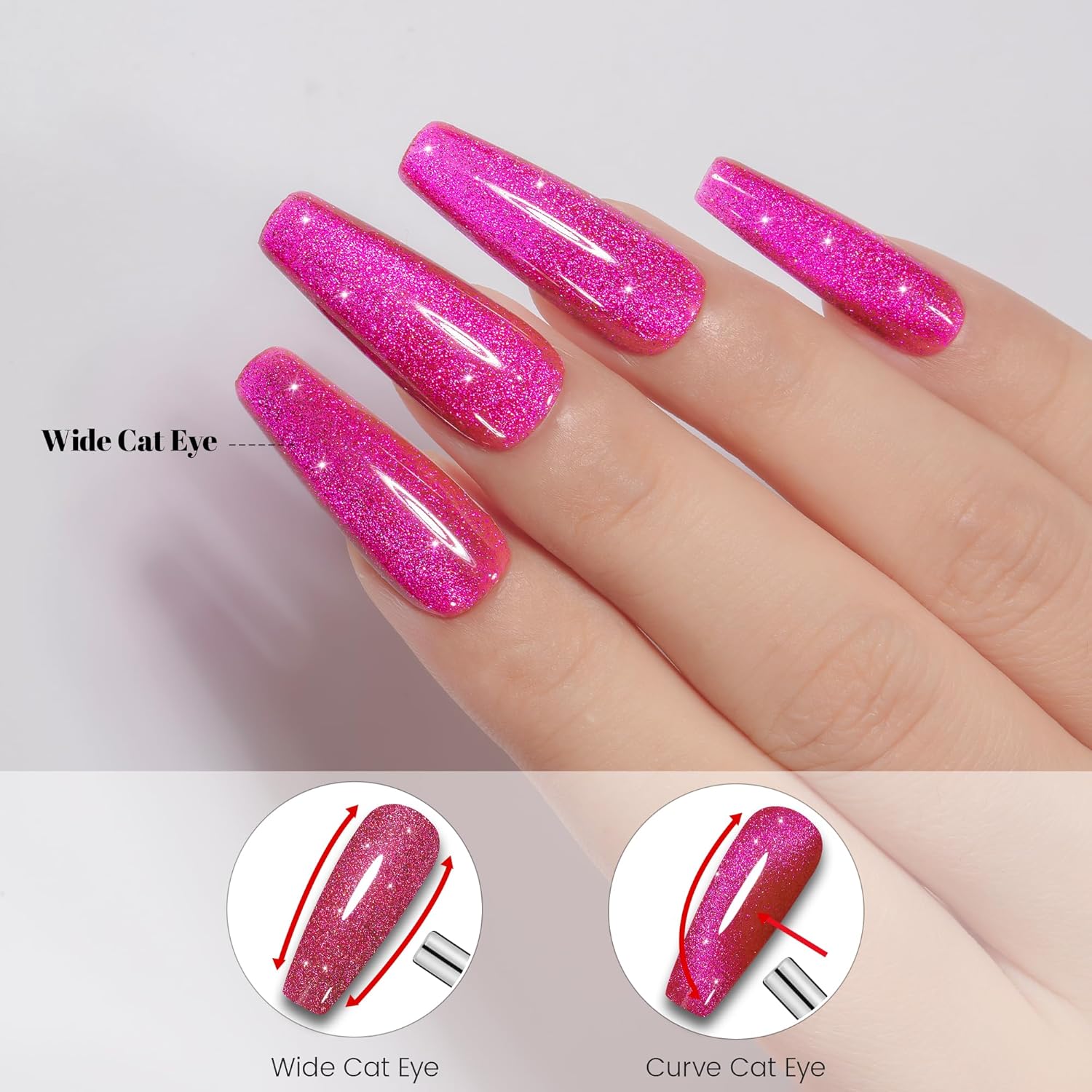 - Glitter Cat Eye Gel with Magnet Stick: The gel contains more upgraded high-gloss magnetic glitter for better shine and sparkle. With the magnet stick and refer to the tutorial for more practice, you can DIY a variety of cat eye patterns with lots of fun.