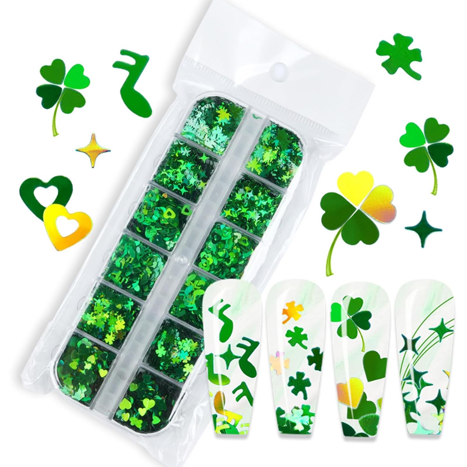 - Quantity:You will get 12 Grids laser green glitter nail art flakes, Contains sequins of various shapes: love heart, four-pointed star, maple leaf, green clover, music note. A box of nail glitter flakes, giving you more choices to decorate your nails.