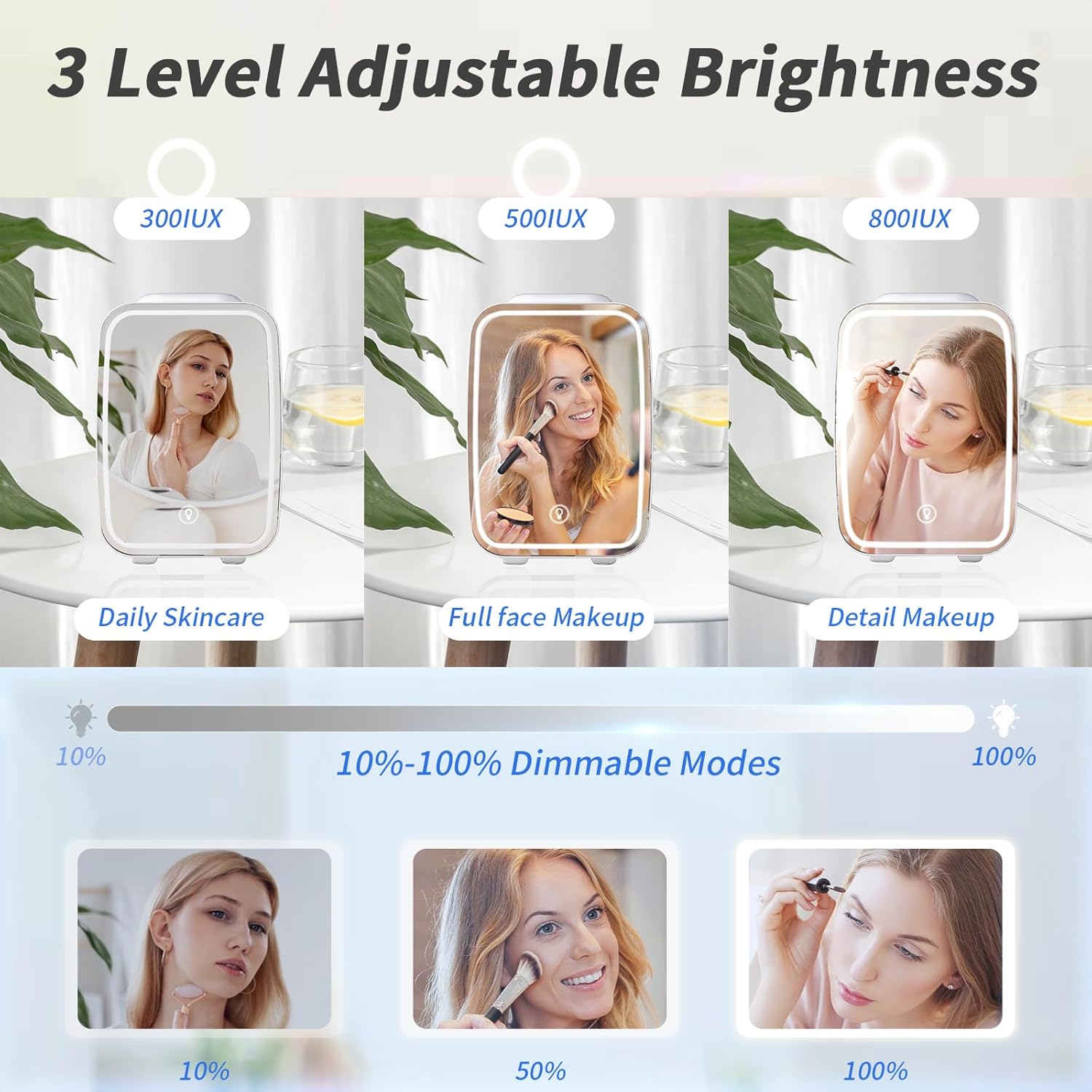 - 3 Level Brightness Adjustable: This mini fridge equipped with a touch screen LED light high-definition mirror glass door, which include low light for daily skincare, medium light for full face makeup and high light for detail makeup. Choose different levels of brightness to suit your preferences and environment