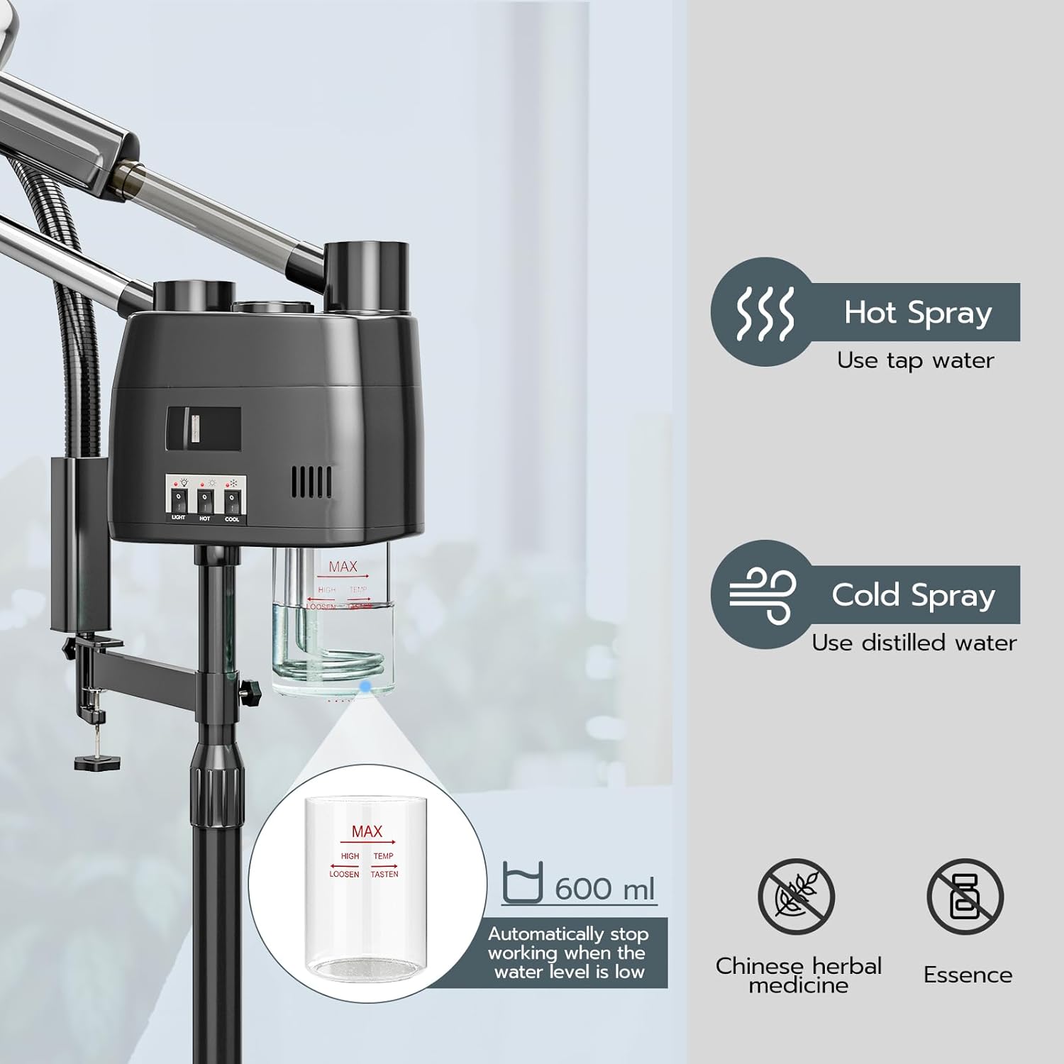 - [Safe & Durable] The water cup is made of ABS plastic and not be easily broken compared to glass, will automatically stop working when there is water shortage to prevent damage to the machine due to overheating. Note that Hot Spray use tap water, Cold Spray use distilled water.