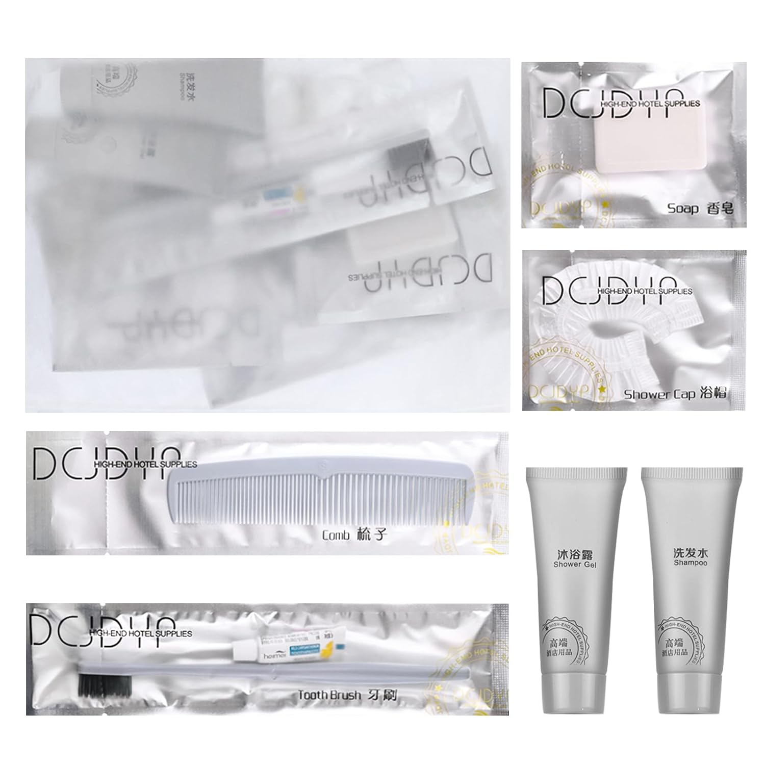 - More sets to match: our hygiene travel kit comes in a pack of 12 sets. Each travel size hygiene products bulk set consists of a Toothbrush, toothpaste, comb, bath gel, shampoo, soap and bath cap. 7 items in a set. personal care travel size toiletries make it even more comprehensive, convenient and comfortable to use.