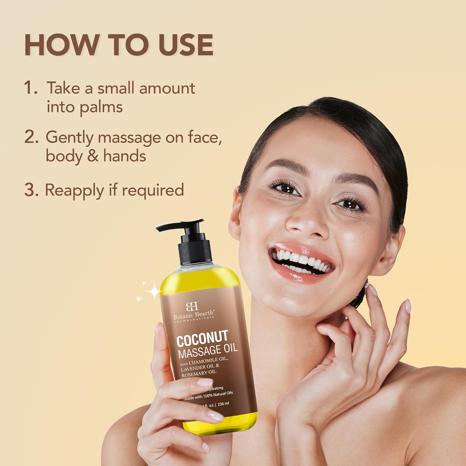 - Natural Massage Oil β Botanic Hearth Coconut Massage Oil is formulated with skin loving ingredients to promote smooth, supple, and soft skin. It contains No Harmful Chemicals and can be used by Men & Women