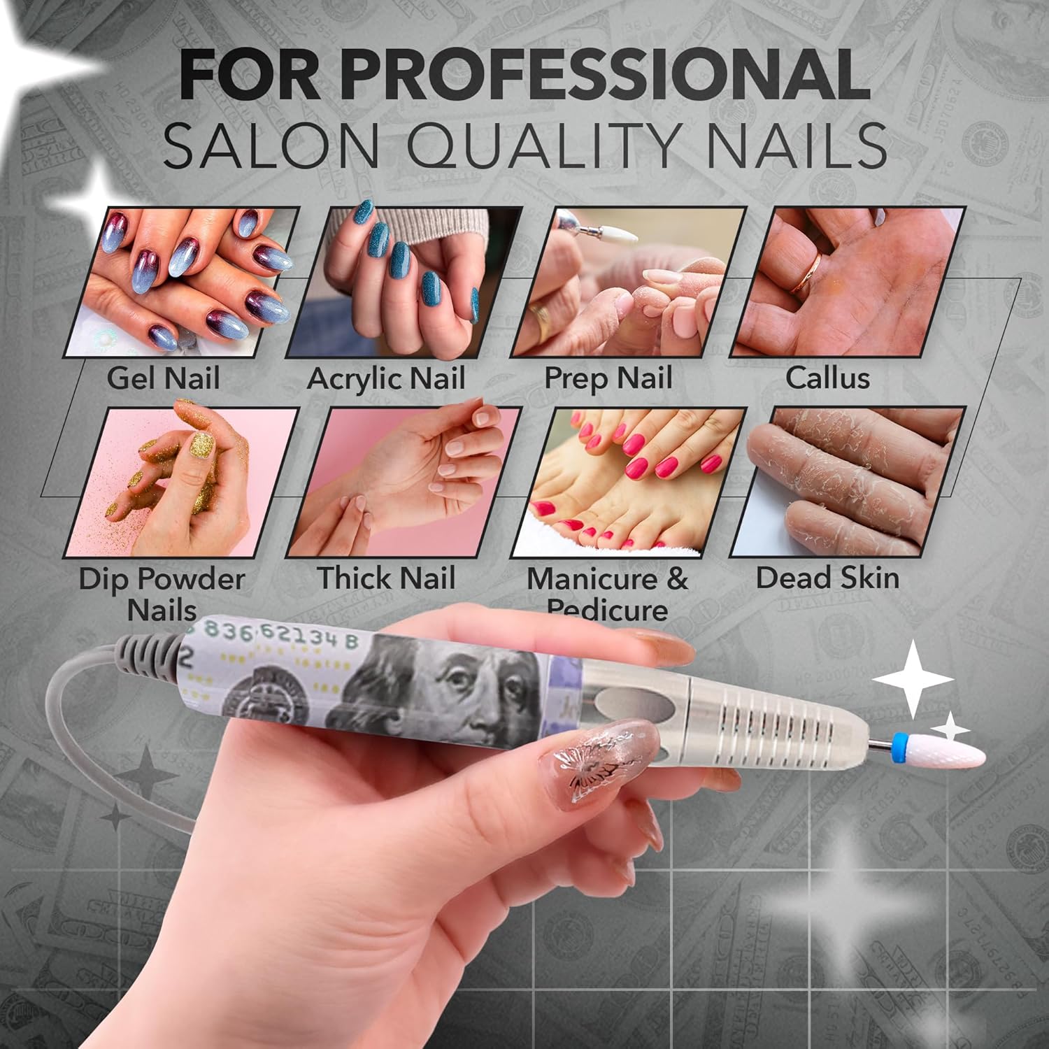 - 2-in-1 to do nails wherever, whenever: The nail drill portable machines features a 2-in-1 desktop and portable wireless design for easy operation at the salon or at home. New acetone-resistant aluminum alloy casing offers exceptional durability, protecting the machine from the corrosive effects of nail polish.