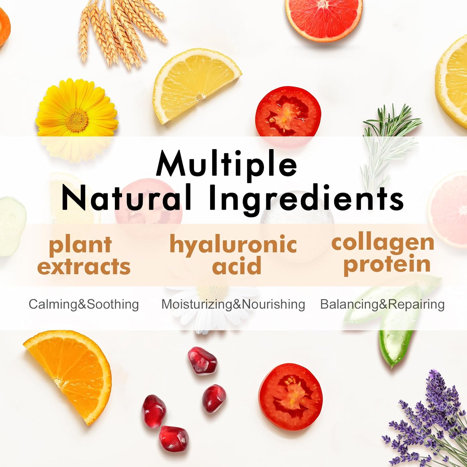 - 【56 Pack Face Mask Gift Set】Our facial sheet masks skincare with 14 natural ingredients like aloe,pomegranate,honey,tomato,ginseng,lavender,sake,oats,grapefruit,chamomile,hyaluronic acid,vitamin C,tea tree,shea butter.Rich collagen essence can be quickly absorbed by the skin,the skin will feel smoother and younger.