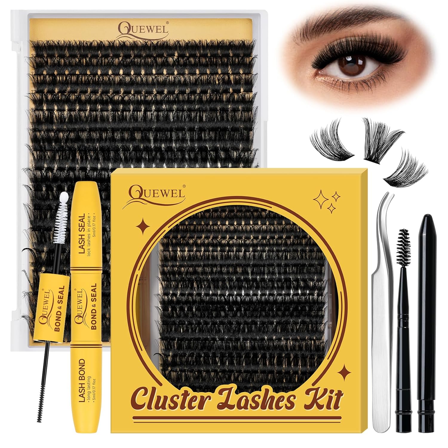 - DIY Lash Extension Kit: QUEWEL Lash clusters kit includes 300pcs lash clusters, lash bond and seal, lash tweezers, and lash brush for cluster lashes. All you need in one kit! You can DIY lash extensions at home by yourself, get charming eye makeup easily