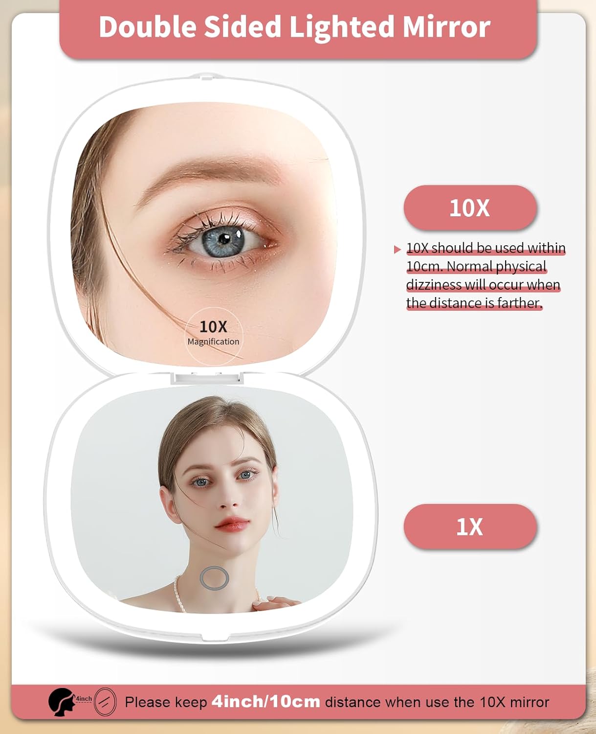 - 10x Magnifying:One side is a 1x HD mirror, equipped with white light to better restore your beauty, and the other side is a 10x magnifying mirror, which can help you magnify facial details. Tip: When using the 10x magnifying mirror, please keep a distance of less than 10 cm, otherwise it may cause normal dizziness and affect imaging