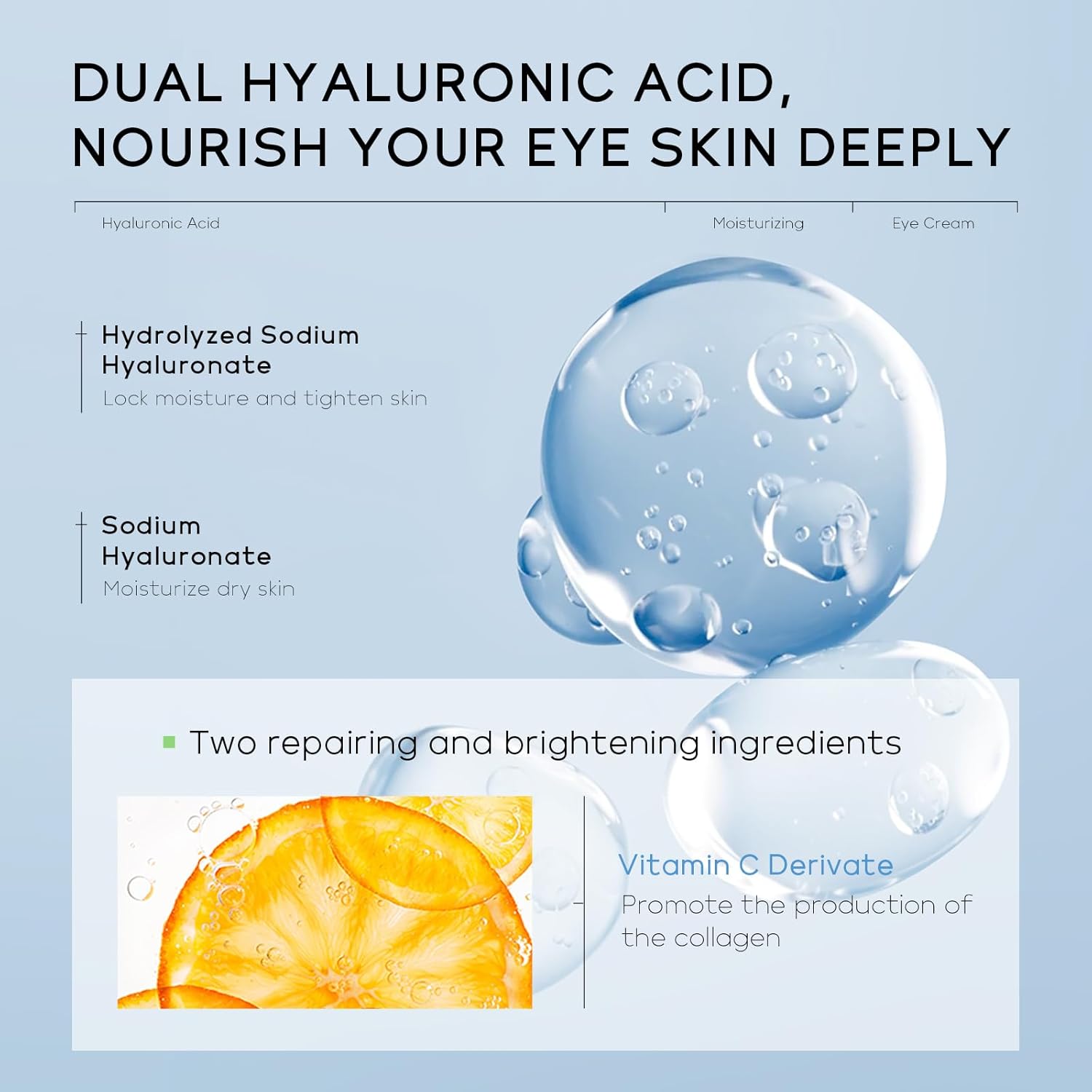 - Intense Moisturizing: Hydrating Eye Repair Cream is formulated with sodium hyaluronate, a key ingredient known for its moisturizing properties. It effectively moisturizes the delicate skin around the eyes, locking in moisture from deep within, enhancing elasticity, and reducing dry lines around the eyes. It also contains small molecule vitamin C and caffeine, which stimulate collagen production, improve eye puffiness and dark circles.