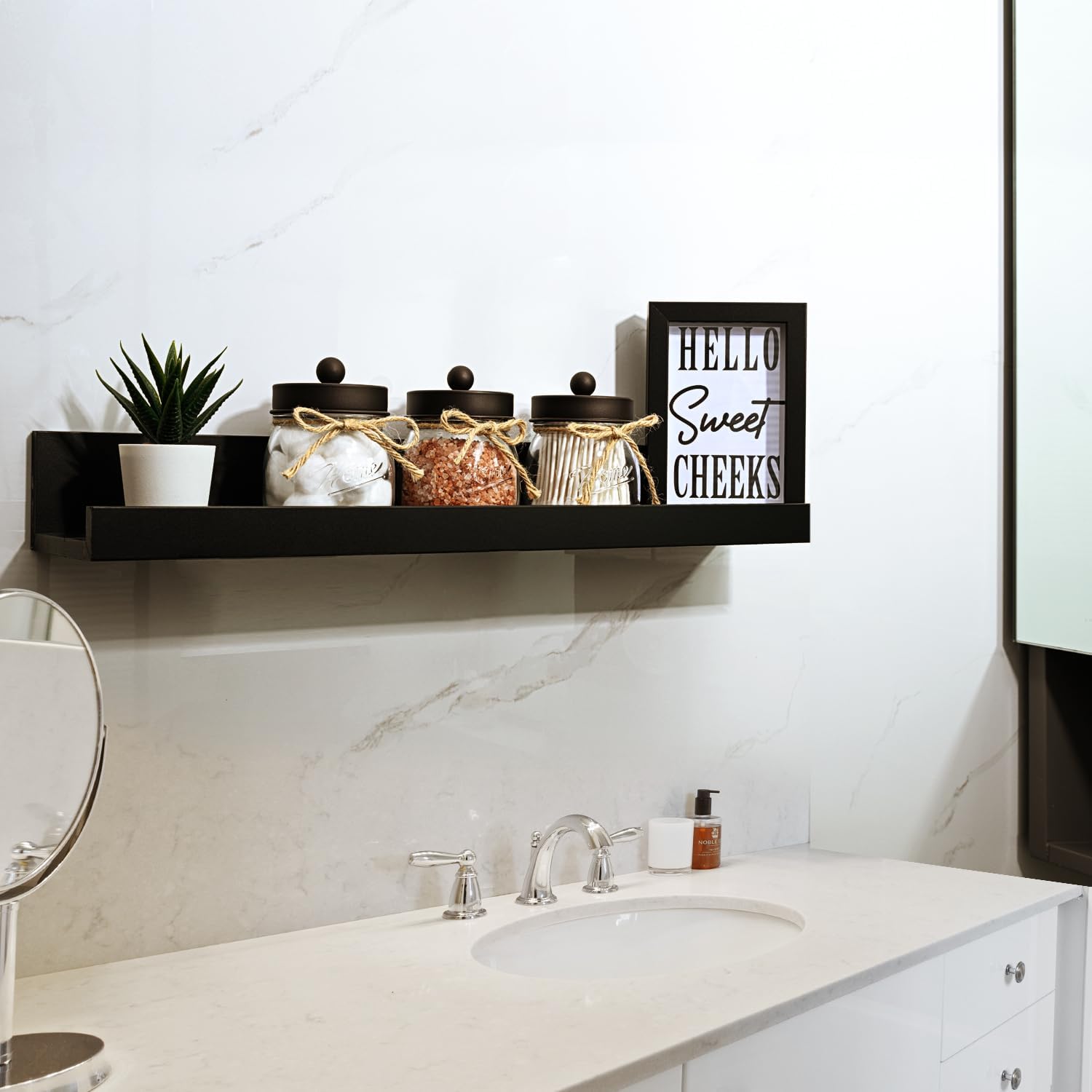 - 💐Elegant and Cute Bathroom Decor: Add charm to your bathroom with this glass bathroom mason jars set! Perfect accent to bathroom shelving, bathroom countertop, makeup vanity, carft room, black and white accented bathroom, and guest bathroom. Ideal for home decor, this collection embodies a variety of styles including rustic, western, farmhouse, and contemporary designs. It is particularly well-suited for bathroom decor and offers a versatile aesthetic that complements both traditional and modern interiors.