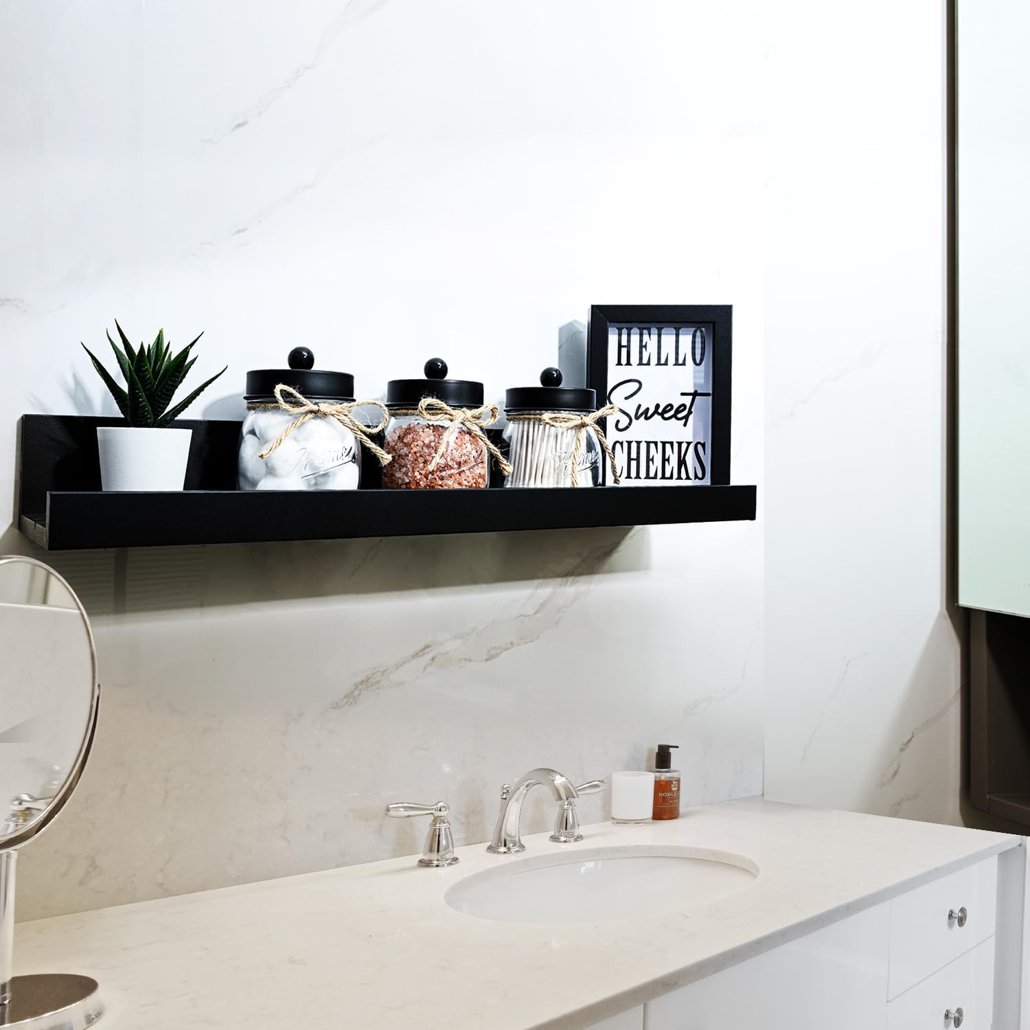 - 💐Elegant and Cute Bathroom Decor: Add charm to your bathroom with this glass bathroom mason jars set! Perfect accent to bathroom shelving, bathroom countertop, makeup vanity, carft room, black and white accented bathroom, and guest bathroom. Ideal for home decor, this collection embodies a variety of styles including rustic, western, farmhouse, and contemporary designs. It is particularly well-suited for bathroom decor and offers a versatile aesthetic that complements both traditional and modern interiors.