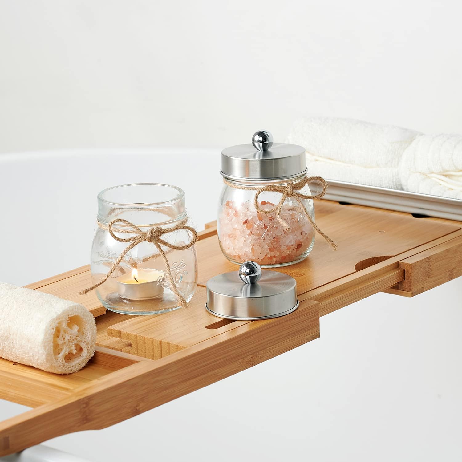 - Easy to Open and Close: This bathroom set includes three 8-ounce glass mason jars with standard-size metal lids. Perfect for any bathroom and they are small enough to fit neatly and keep by the sink and not get in the way or make the counter look cluttered. These lids provide a secure fit, an easy-open design, and rust-resistant properties. Please note: the lids are designed for a lift-off mechanism rather than a screw-on closure. It makes it so much easier to lift off the top and reach in for a cotton ball or cotton swab.