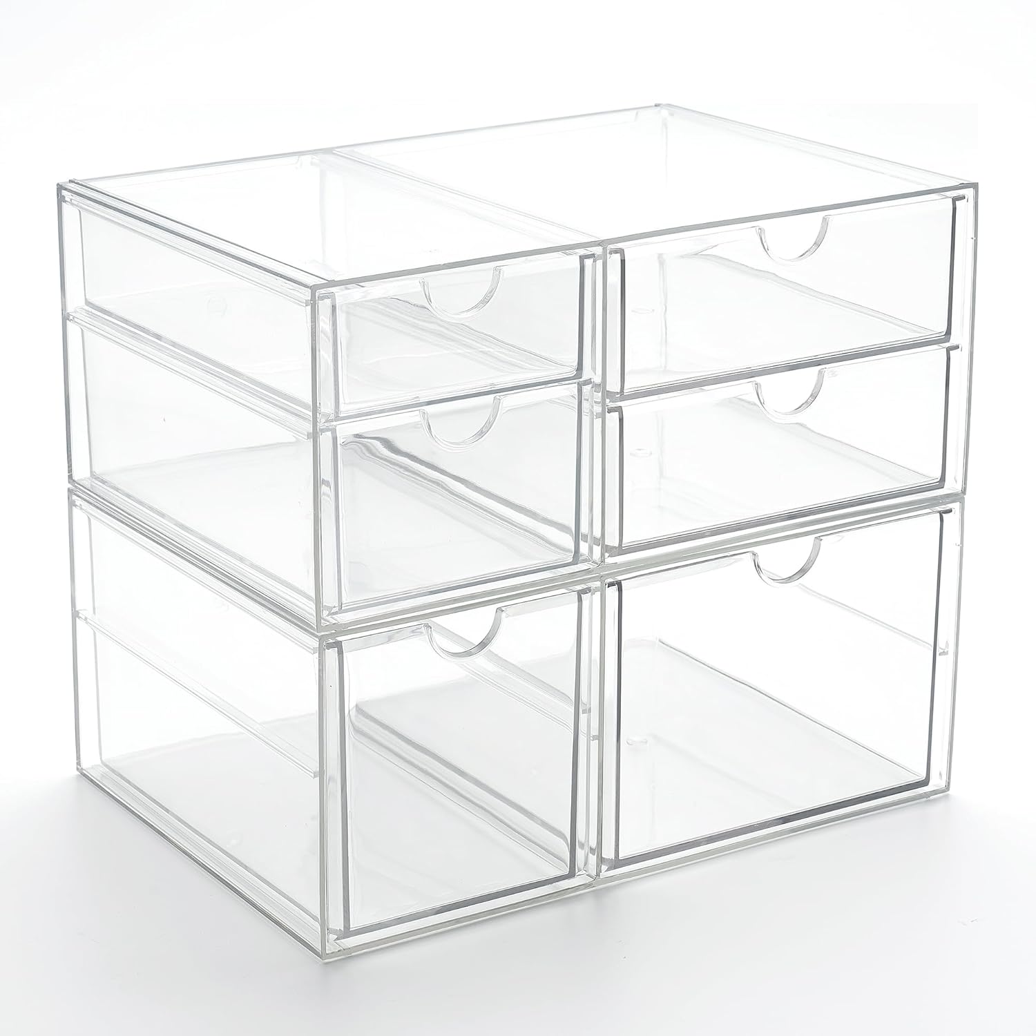 - Multiple Sizes and Expandable: This set includes 2 individual acrylic drawer units, offering a total of 6 drawers, these clear drawer organizers provide customizable combinations to meet your specific storage and organizational needs. Each acrylic drawer units is 4.2x6.89x9.92 inches. The largest drawer is 5.7 (L) × 4.2 (H) × 6.9 (W) inches, while the smallest one is 4 (L) × 2 (H) × 6.9 (W) inches. Not suitable for baby bottles or other items larger than 6.7 "x5.6"x 4".