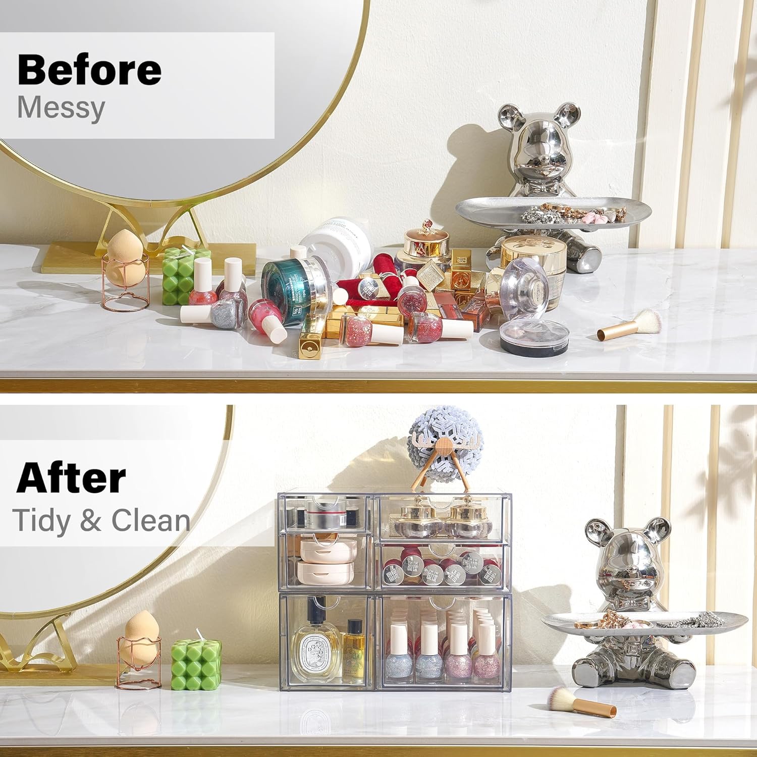 - Unique Design: The clear design of makeup storage allows for easy identification of contents. Made from durable, unbreakable plastic, they are equipped with silicone anti-slip pads on the bottom to prevent movement when the drawer organizer storage is opened or closed, ensuring a steady and reliable storage solution.