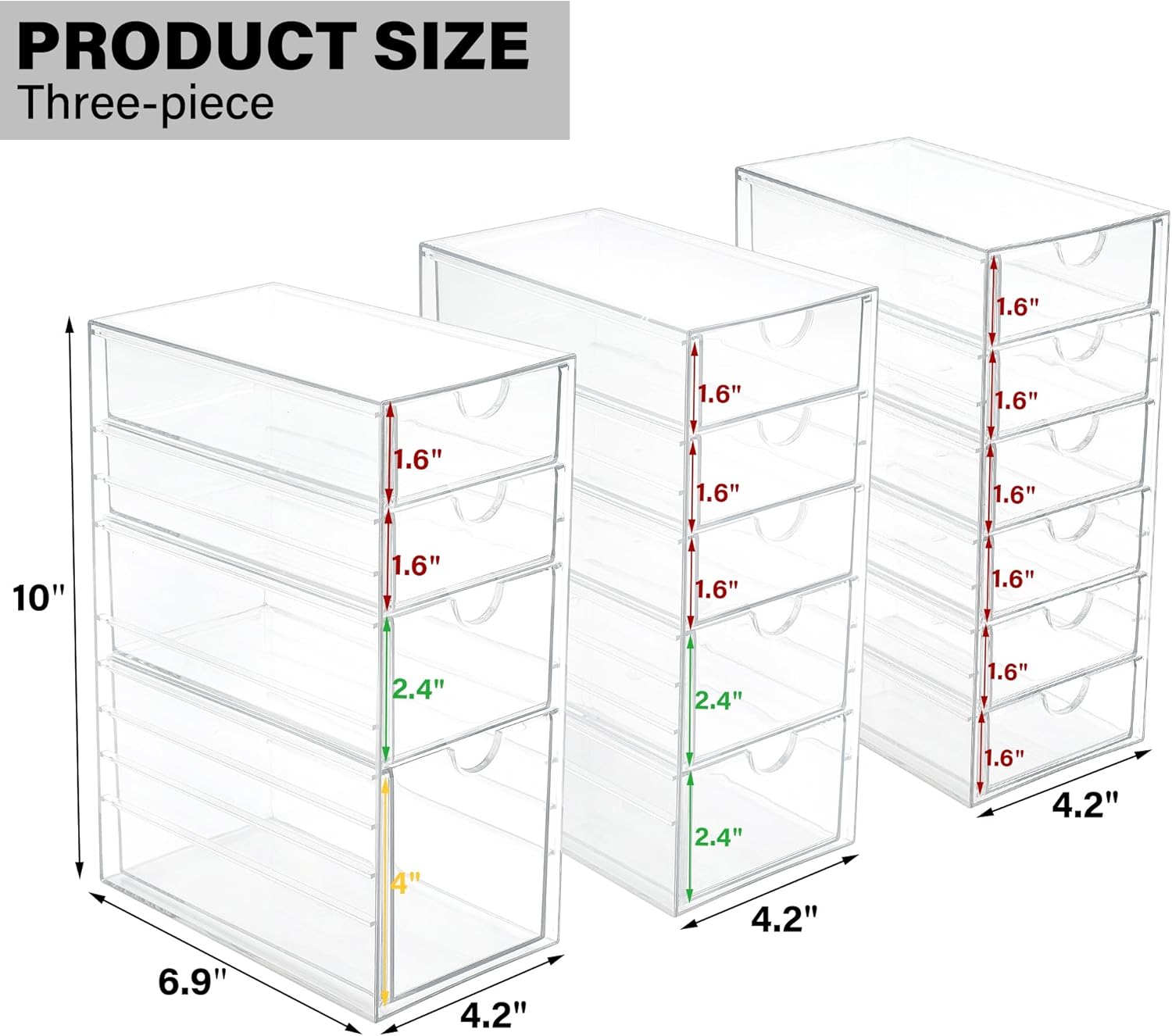 - Multiple Sizes and Expandable: This set includes 3 individual acrylic drawer units, offering a total of 15 drawers, these clear drawer organizers provide customizable combinations to meet your specific storage and organizational needs. Each acrylic drawer units is 4.2x6.89x9.92 inches. The office supply organizer can be stacked vertically or expanded horizontally, allowing integration with other sizes and dimensions of storage solutions available in our store.