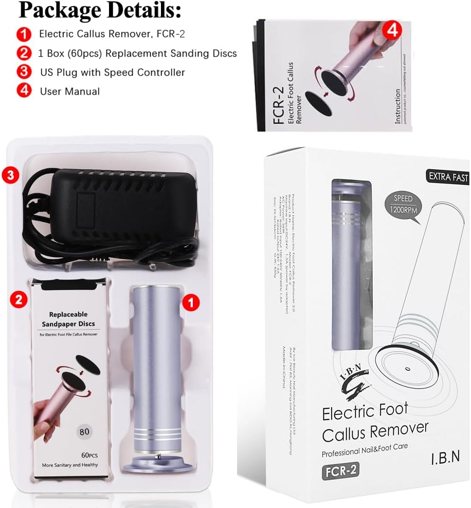 - Package Details: 1 x upgraded electric heel callus remover 1200 rpm, 1 x box of 60-pack sandpaper, 1 x US socket, 1 x instruction manual. Please note that the machine is not waterproof.