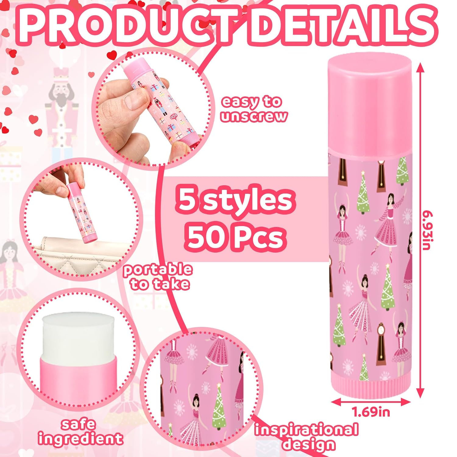 Dunzy 50 Pcs Christmas Lip Balm Gifts Bulk Pink Christmas Nutcracker Themed Lip Balm Xmas Lip Moisturize for Lip Care Xmas Holiday Party Stocking Stuffers, 5 Flavors
