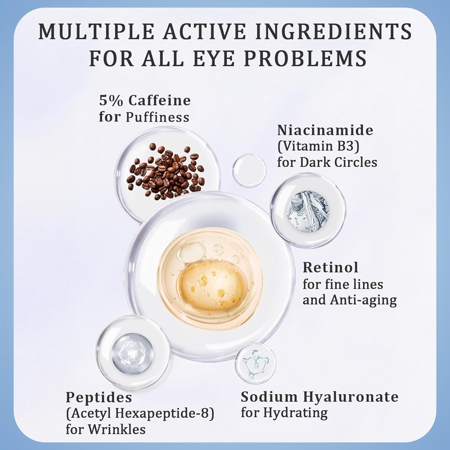 - Eye Cream with Powerful Ingredients: 5% caffeine, retinol, niacinamide, hyaluronic acid, and peptides to help with well-aging, reducing puffiness, or getting rid of dark circles. Reveal brighter, more youthful-looking eyes!