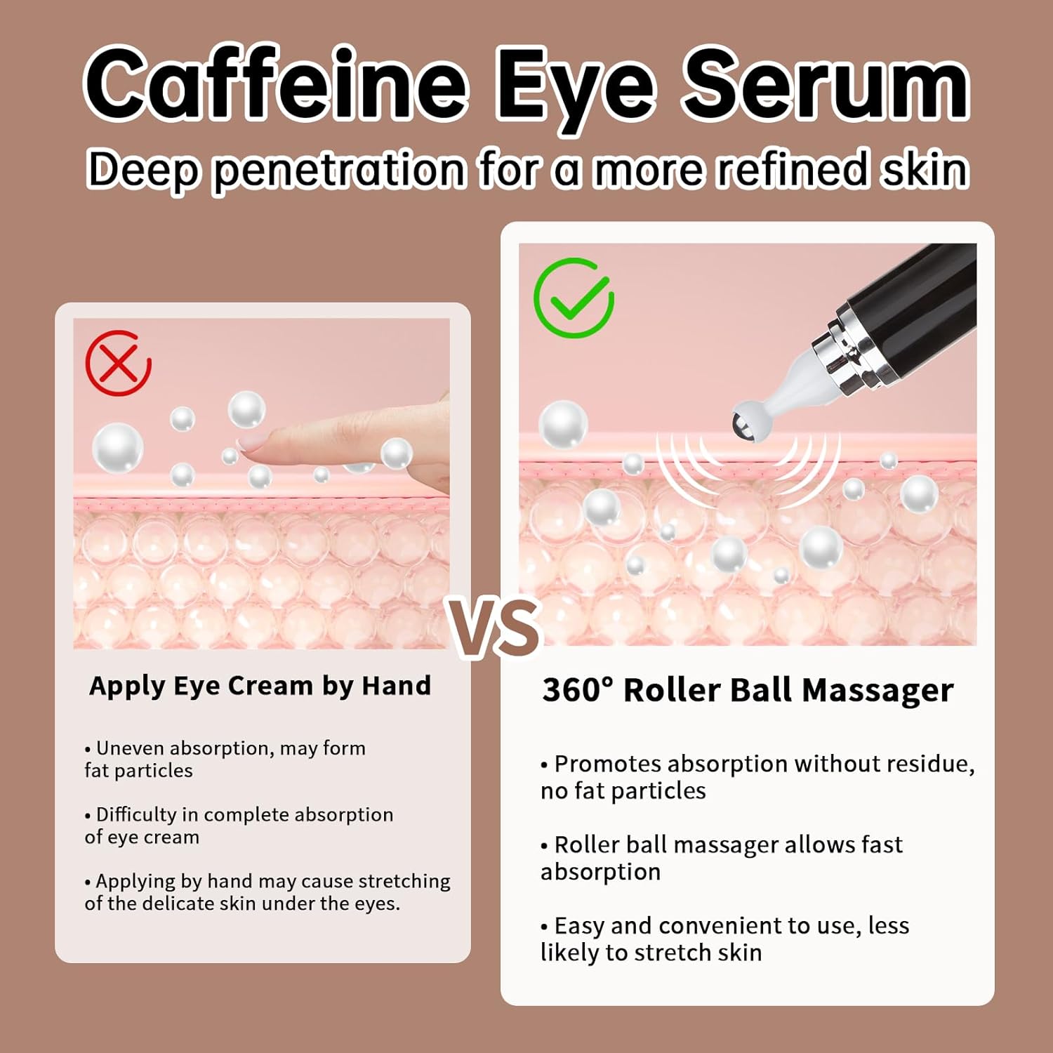 Caffeine 5% Eye Cream for Dark Circles, Under Eye Cream for Puffiness, Bags & Wrinkles, 1 PCS Anti Aging Eye Serum with Under Eye Roller, Reduces Fine Lines & Moisturize Skin.