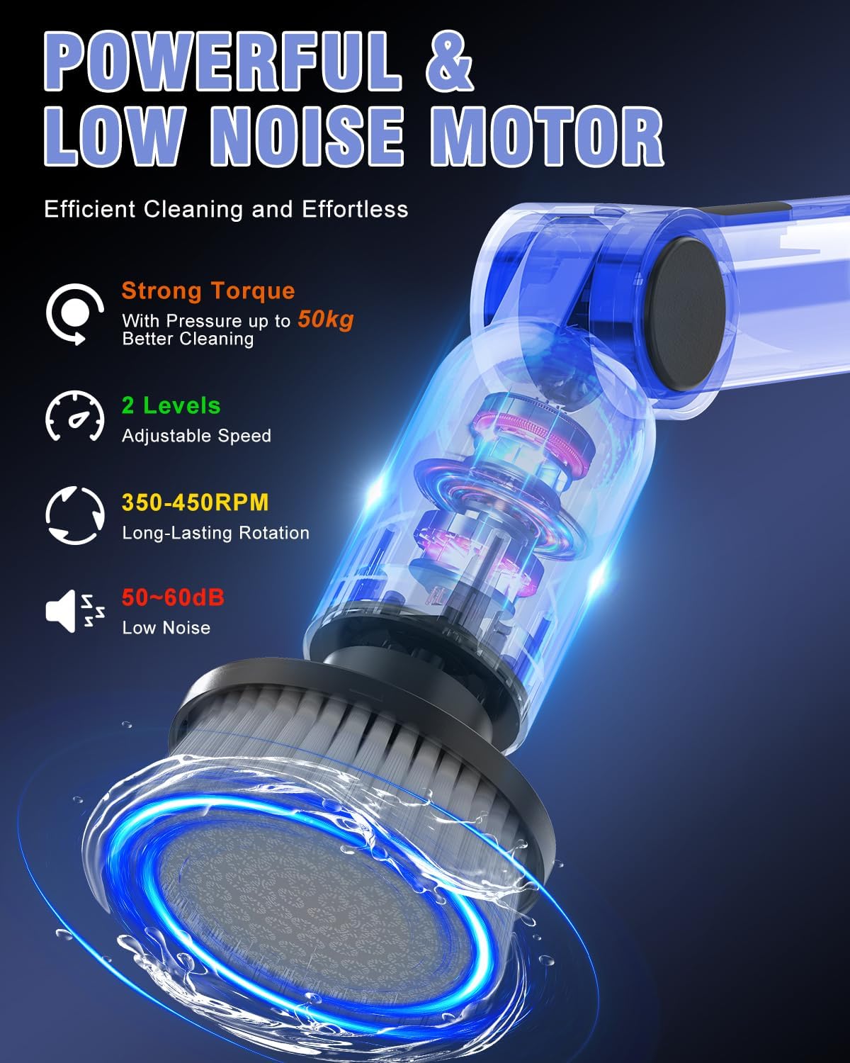 - 【POWERFUL & LOW NOISE MOTOR 】50KG Twist - Greater Cleaning Power,Compared with other electric cleaning brushes, Homtronics shower scrubber is more powerful, it is designed with 2 speed control modes: High speed mode: 450r/min and ② Low speed mode: 350 rpm,which means moderate and reasonable speed to ensure waste water does not splash randomly during cleaning. There's also a lower noise level when running, so you can use it more smoothly.