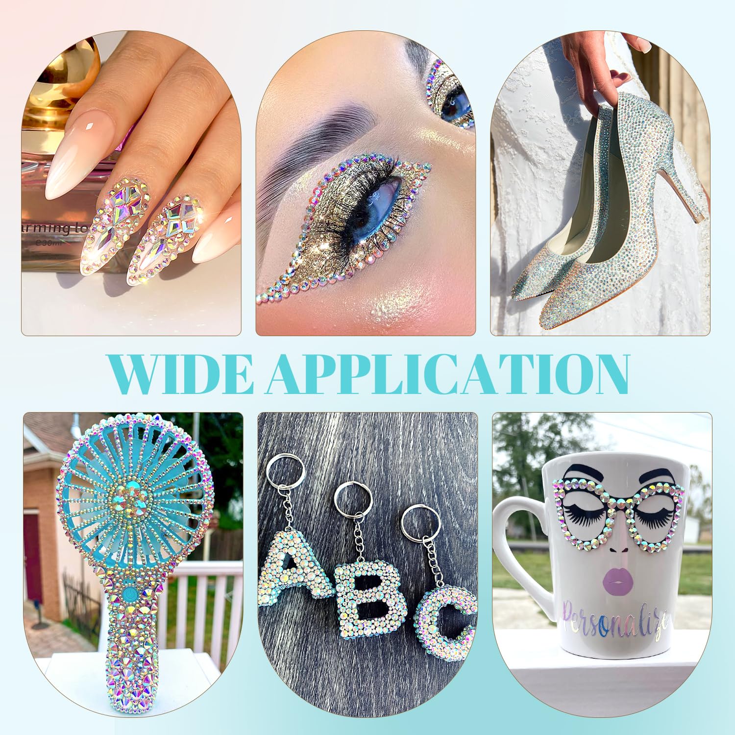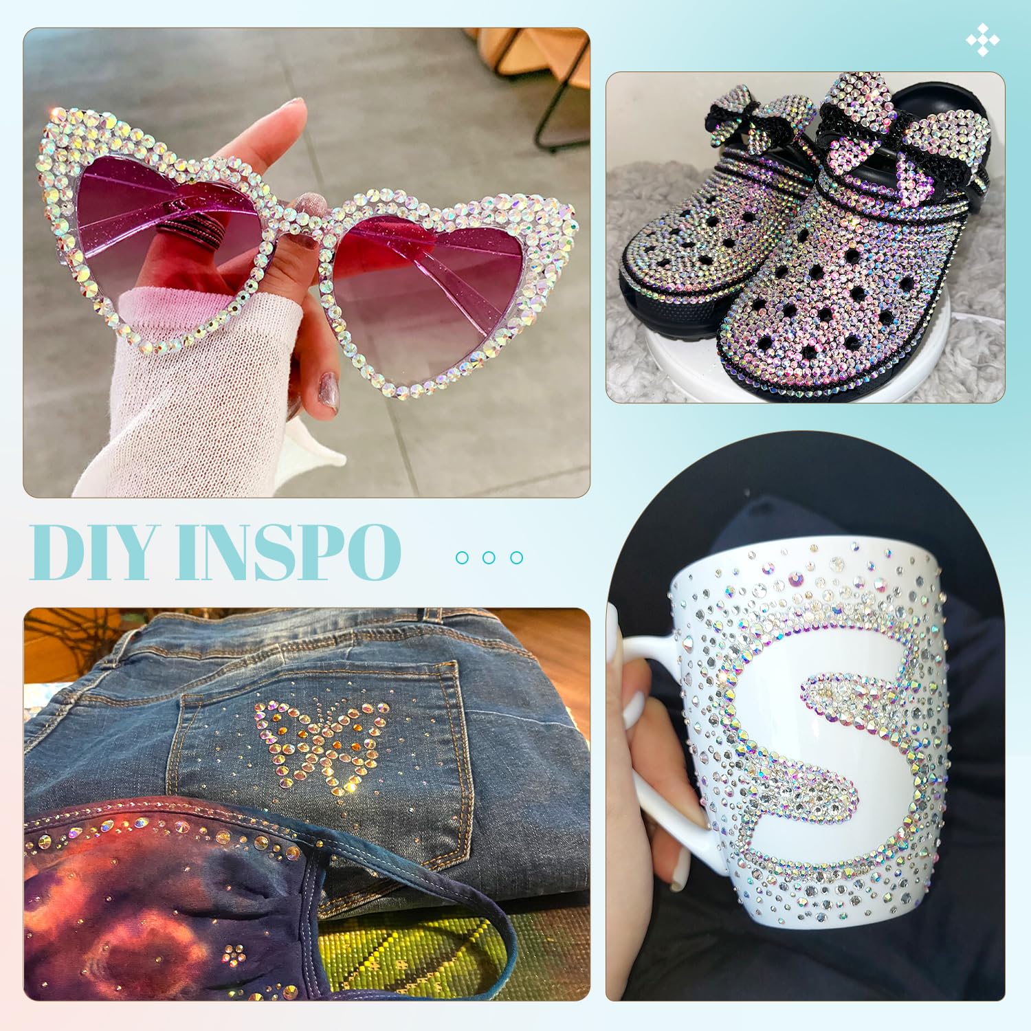 - 💎WIDE APPLICATION -- These sparkling iridescent resin crystals are perfect for creating dazzling looks. Use them for bedazzling DIY crafts like shoes, tumblers, mugs, bottles, phone cases, popsockets, scrapbooks, photo frames, diamond paintings, greeting cards, bags, glasses, guitars, keychains, hats, masks, hair clips, bracelets, wristbands, clothing, wedding dresses, and more. Apply it to what you want to bling!
