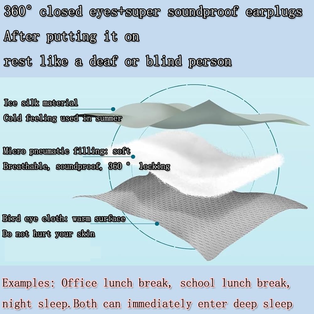 - Eye Mask+Earplugs: 360 ° blackout sleep mask, filled with micro air cotton material, the mask is very gentle and covers the eyes all night long, without squeezing the nose, ears, and skin, and will not harm the skin. At the same time, wearing silicone earplugs, soft material, will not squeeze the ears, with 4 levels of sound insulation effect, will make you sleep like a deaf or blind person, quickly entering deep sleep