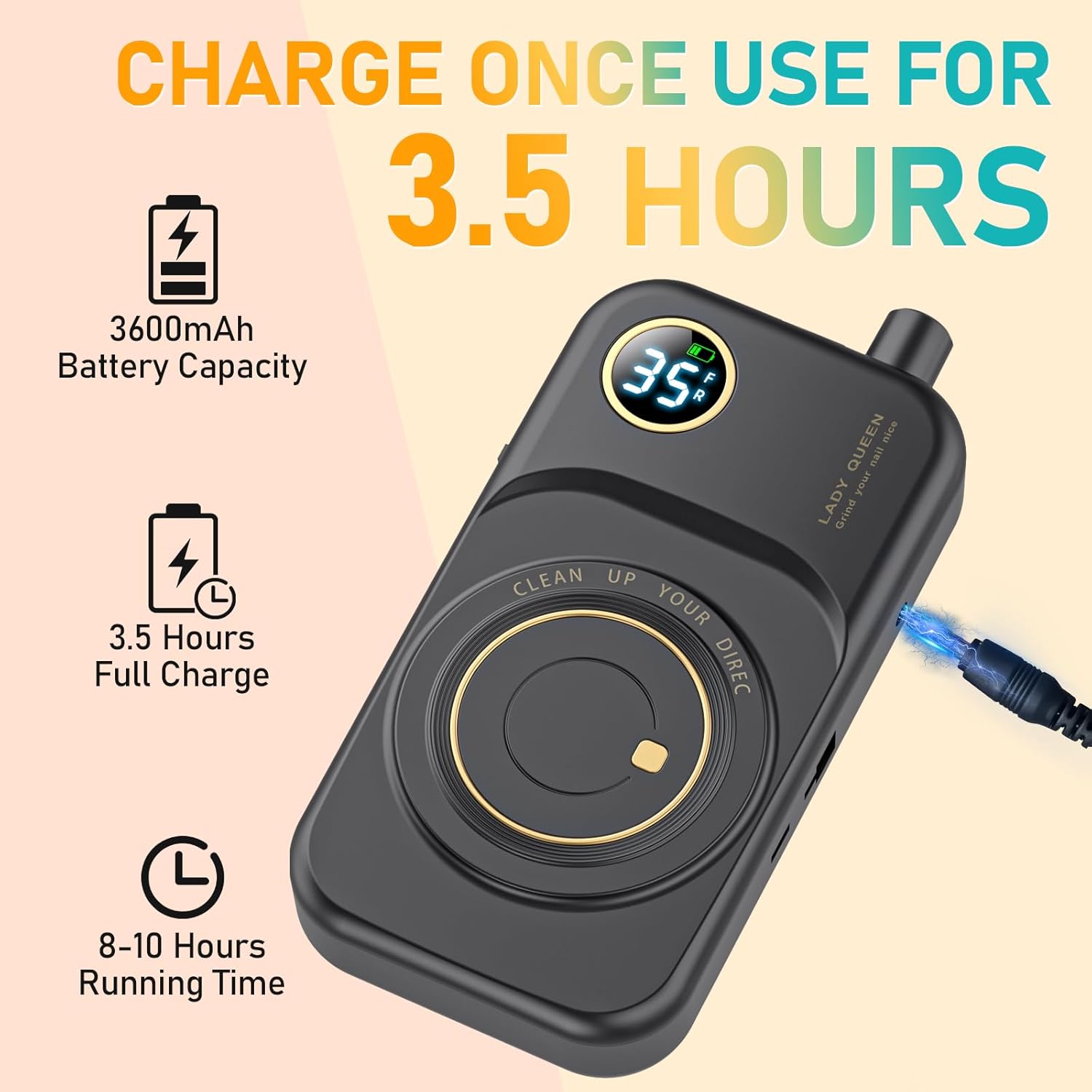 - 【Portable & Easy to Use】 Up to 8-10Hours Work Time -Electric nail drill for acrylic nails built-in 3600mAh rechargeable Li-ion battery. Being fully charged for about 3-4hours, the electric nail filer will work up to 8-10 hours. The LCD display on the cordless electric nail drill machine shows the speed and the remained battery level, which is convenient for you to adjust the speed and to remind you of charging.