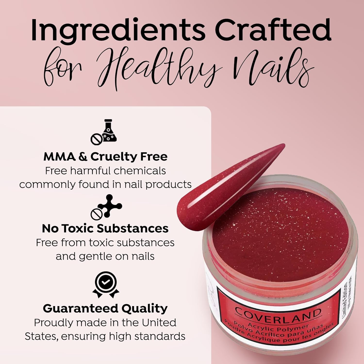 - PROFESSIONAL GRADE: The flexibility and adhesion properties of Coverland colored acrylic nail powder make it easy to shape nails with precision, and offers nice control for professionals who prefer to work with a polymerization rate of moderate to fast.