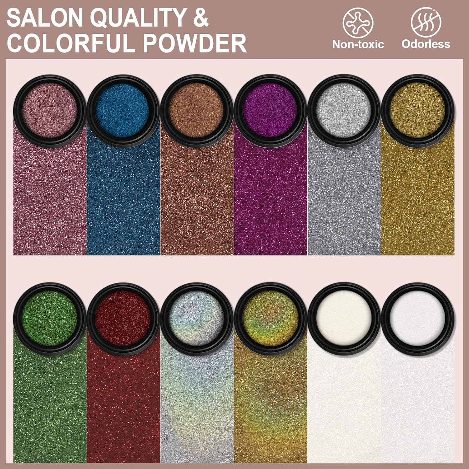 - QUALITY AND QUANTITY :Each jar has 1 gram of powder, instead of just a little bit per jar. Artdone chrome nail powder has very good shining mirror effect, they can made different effects with different background colors. If you need a darker color, you can choose black or another dark color as the base color, if you need a lighter color, you can choose a white、pink or transparent base color to applied powders