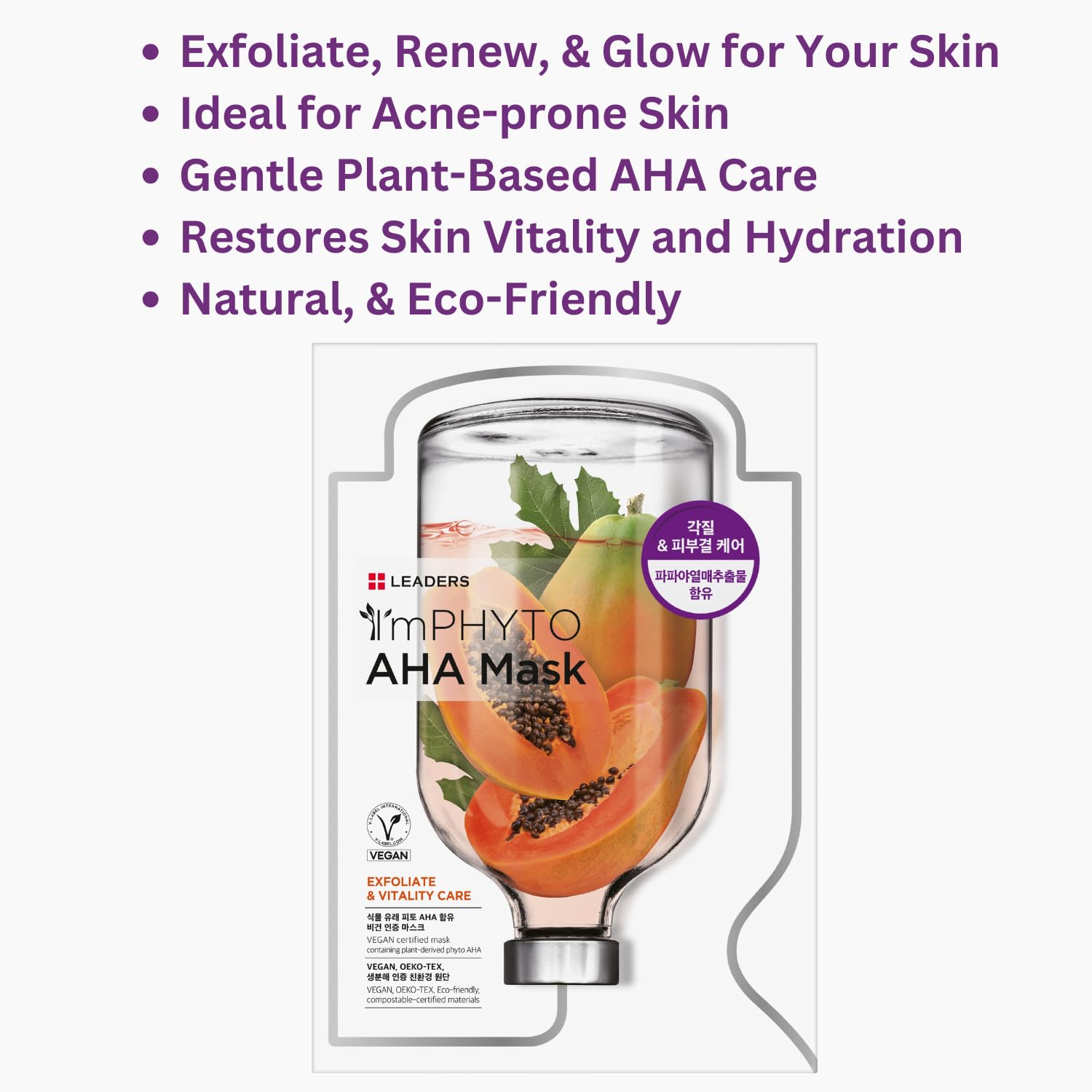- CERTIFIED VEGAN & CRUELTY-FREE – Leaders I'M PHYTO AHA Mask has been officially certified by Italy's V-Label, ensuring our products are free from animal-derived ingredients and has not been tested on animals, so you can feel good about indulging in our skincare products. Ideal for individuals prioritizing ethical and sustainable beauty solutions, our AHA Mask delivers effective skincare results with eco-friendly practices. Embrace the feeling of exfoliated, revitalized skin and good conscience!