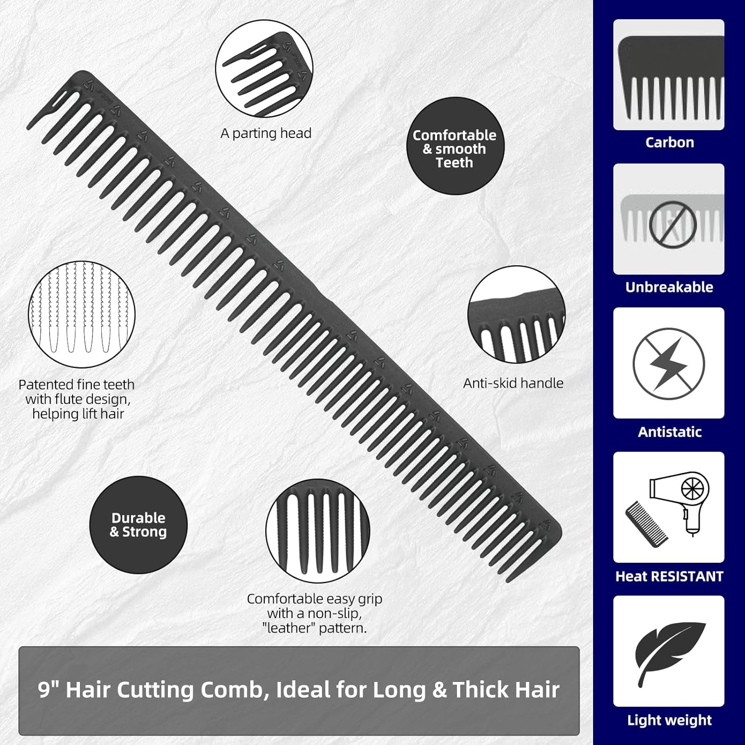 PERFEHAIR 2-Pack Professional Round Tooth Hair Cutting Comb - 9 Inch, Black Carbon Fiber Anti-Static & Heat Resistant, Durable Barber Combs with Fine & Wide Tooth for Precise Haircut for Men & Women