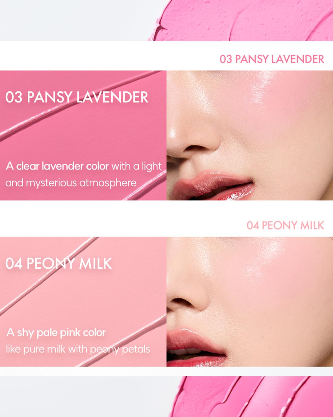 - PANSY LAVENDER: A clear lavender color with a light and mysterious atmosphere, this cream blush adds a touch of enigmatic charm to your look. Ideal for any skin tone, its sheer finish infuses your cheeks with a mystical vitality, perfect for creating a soft, romantic flair.