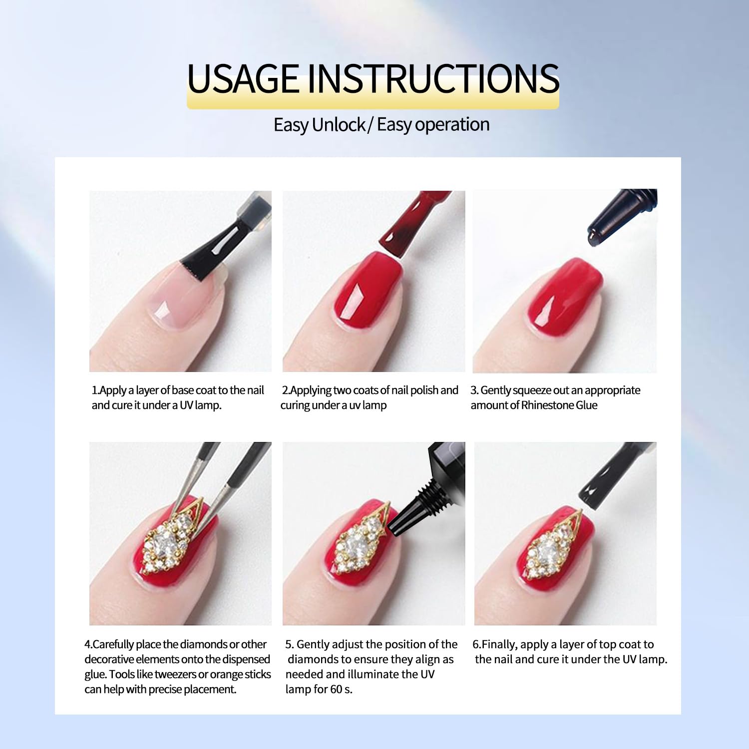 - Easy to Use: The rhinestone glue for nails is user-friendly and easy to control. It allows you to create intricate nail art designs with ease. The needle-tip design makes it easy to dispense and apply the glue,you'll find this nail glue gel intuitive and convenient to work with,even for beginners in nail art.