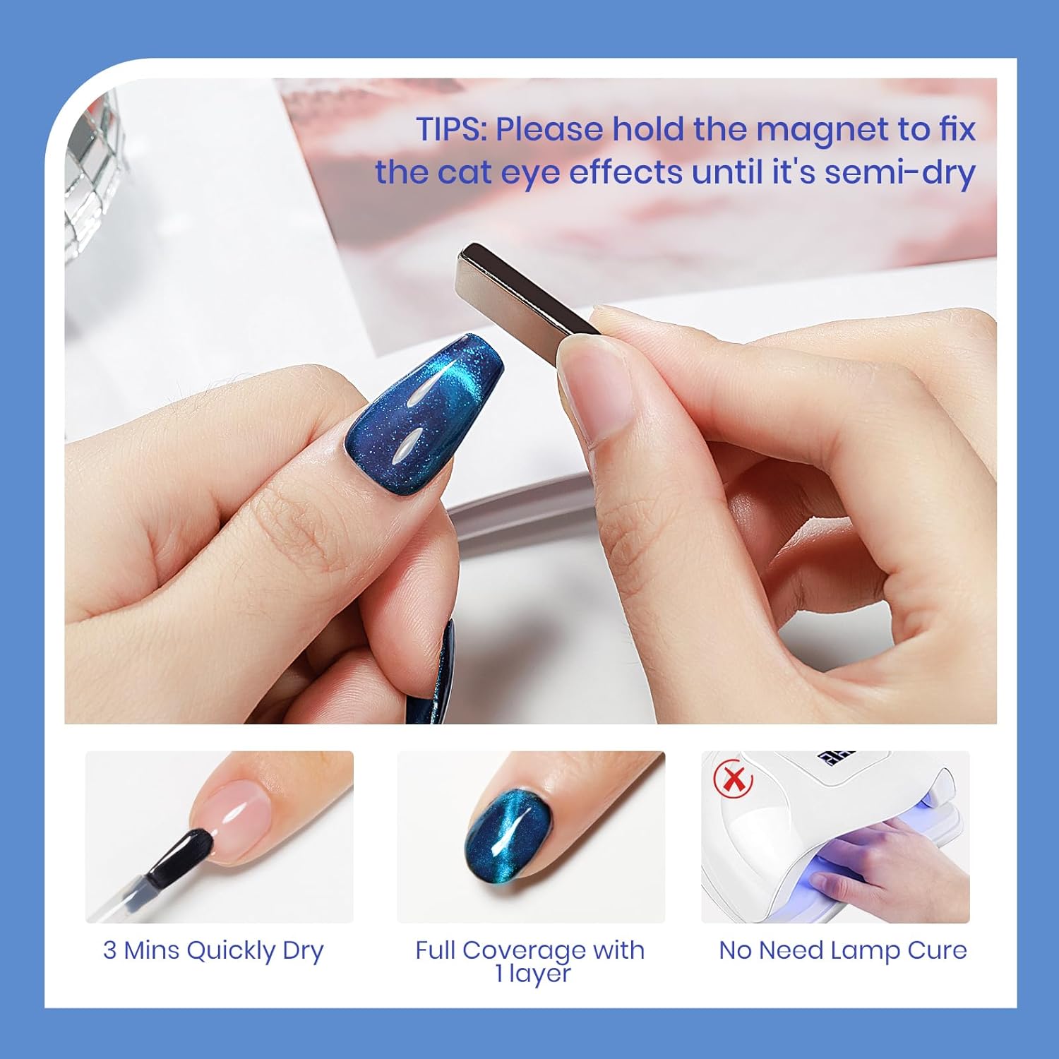 - Quick Dry Cat Eye Effect: Get your glam on with our high capacity 16ml(0.54fl oz) Shimmer Navy Blue Cat Eye Nail Polish and Wide Magnetic Stick, perfect for creating various stunning cat-eye designs to elevate your nail art