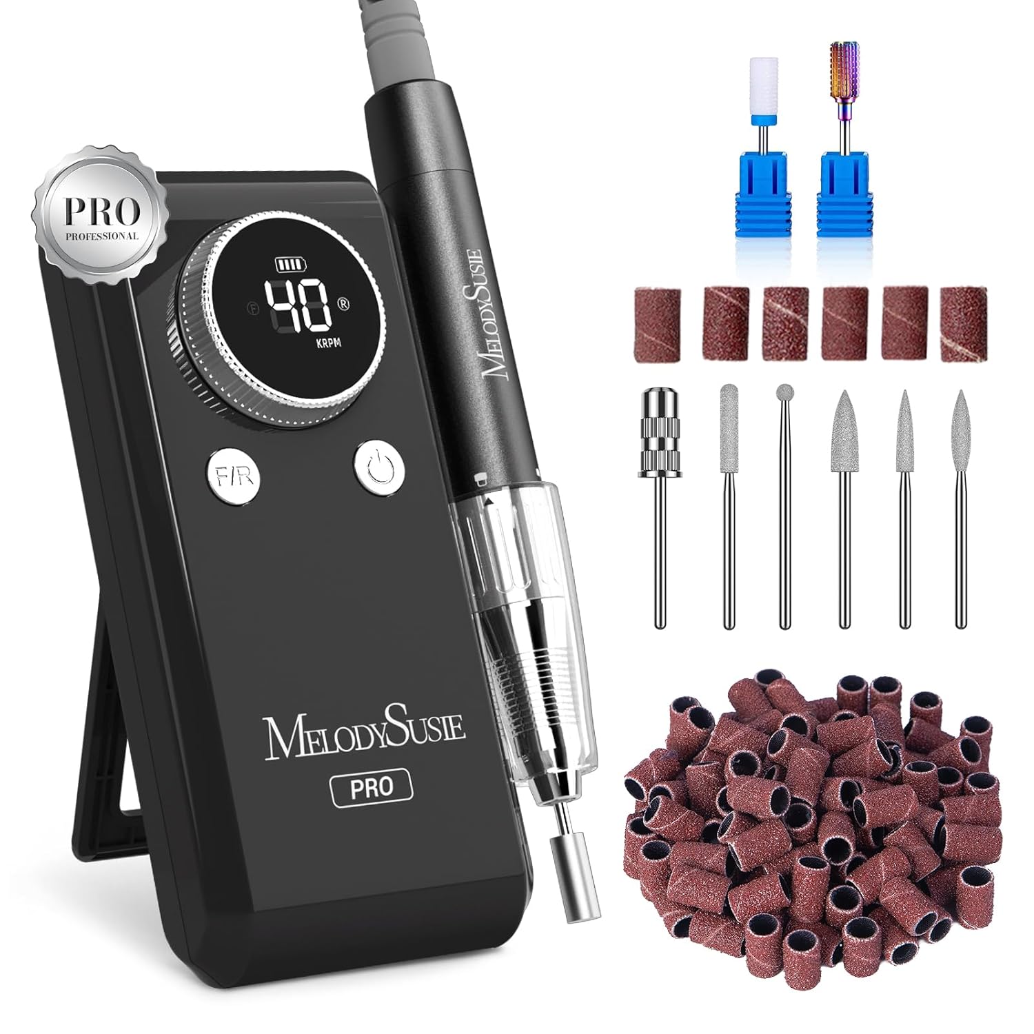 MelodySusie Professional 2 in 1 Nail Drill Kit 40,000 RPM, MB420G Brushless Portable Cordless Rechargeable Electric Nail File, Efile Nail Drill Machine for Acrylic Gel Nails Polishing Removing, Black